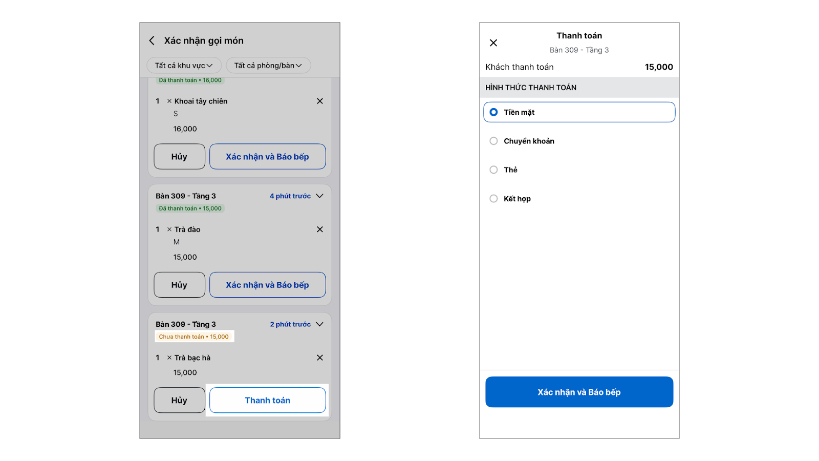 - Nhân viên quán cần thu tiền trực tiếp của khách và thực hiện Thanh toán bổ sung → chọn hình thức thanh toán, trước khi nhấn Xác nhận và báo bếp