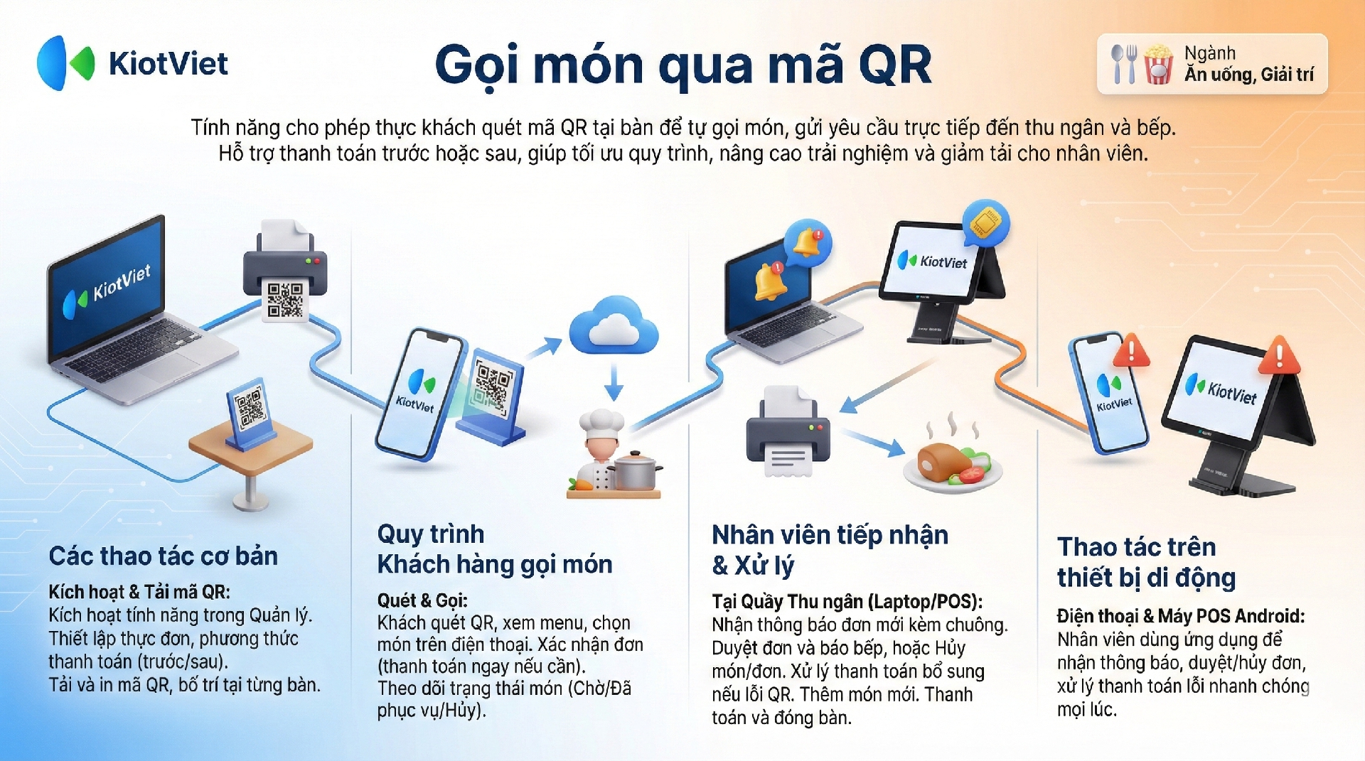 Tính năng Gọi món qua mã QR cho phép thực khách sử dụng điện thoại cá nhân quét mã QR tại bàn để xem thực đơn điện tử, lựa chọn món ăn và gửi yêu cầu trực tiếp đến hệ thống nhà hàng. Yêu cầu này sẽ được chuyển ngay lập tức đến bộ phận thu ngân và bếp, giúp tối ưu hóa quy trình phục vụ và giảm thiểu thời gian chờ đợi. Tính năng này hỗ trợ linh hoạt cả hai hình thức thanh toán: Thanh toán sau (cuối bữa) và Thanh toán trước (ngay khi đặt món).