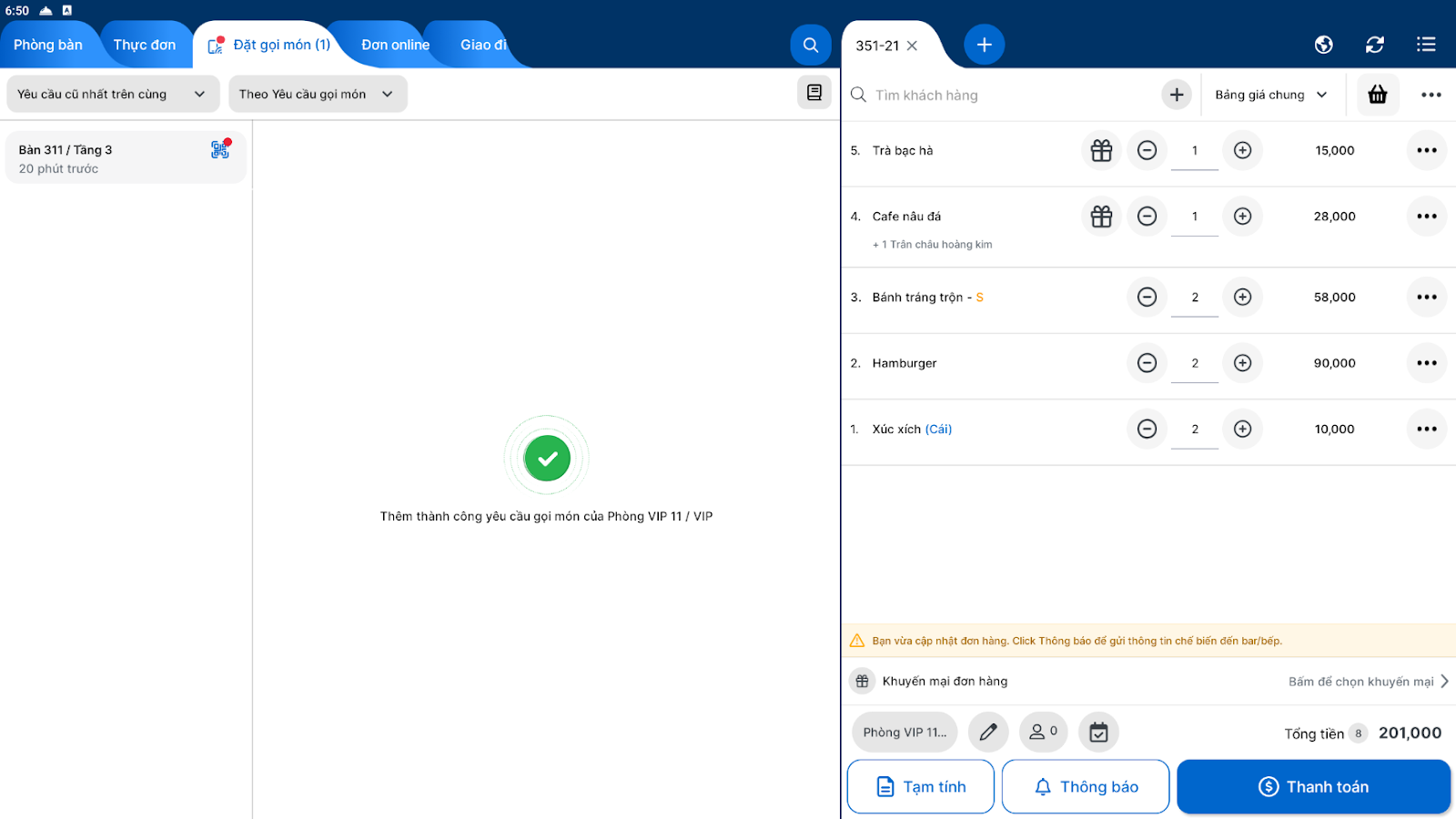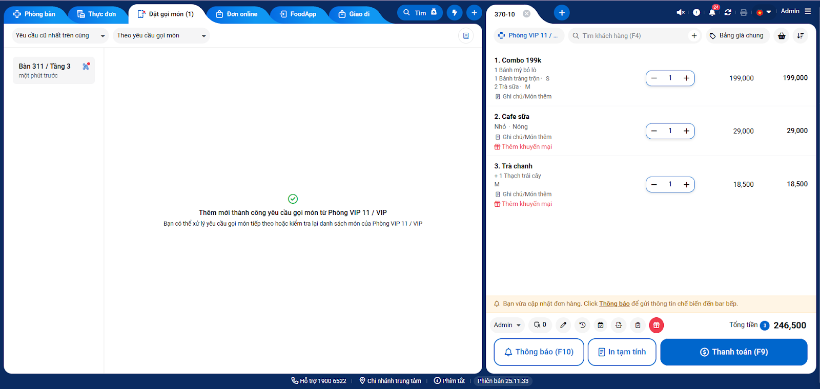 - Bạn tiếp tục các thao tác như bình thường (thông báo bếp, thay đổi thông tin, thanh toán…).