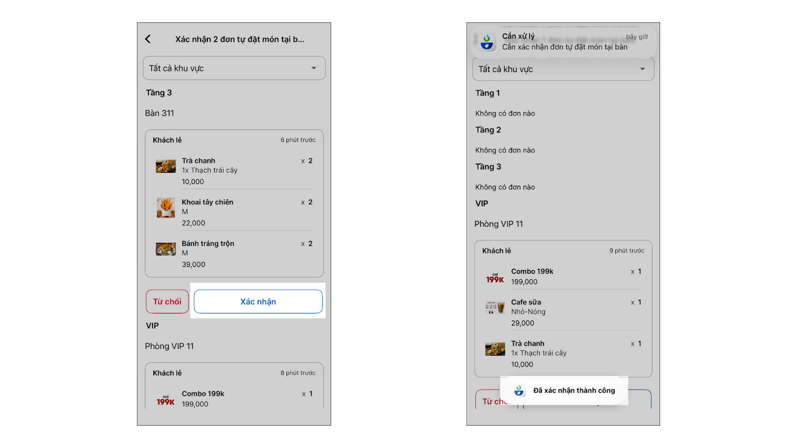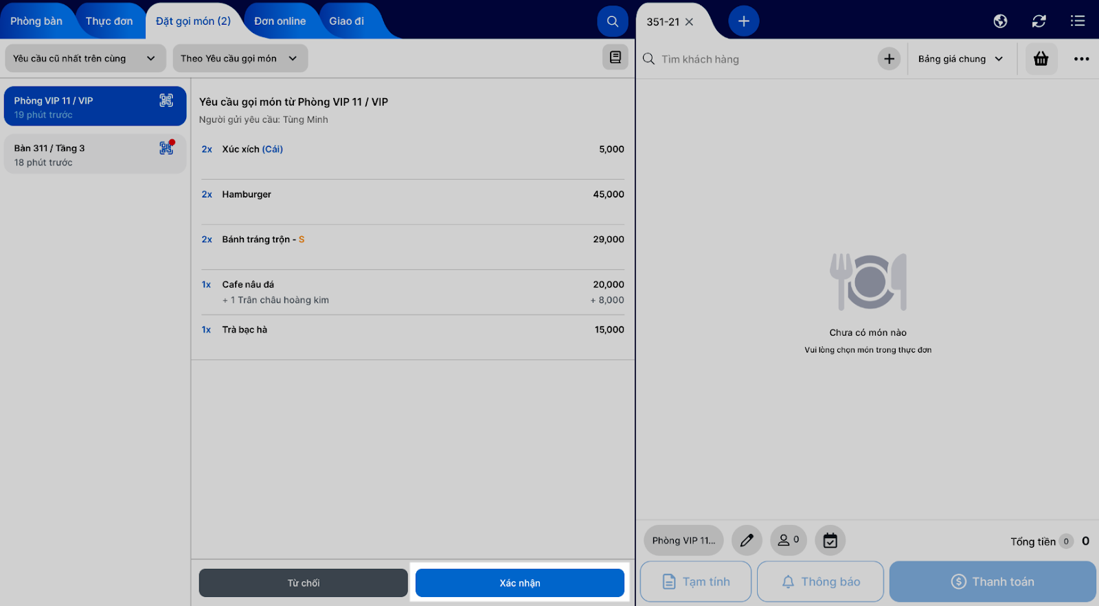 - Trên yêu cầu gọi món của bàn bạn nhấn Xác nhận.