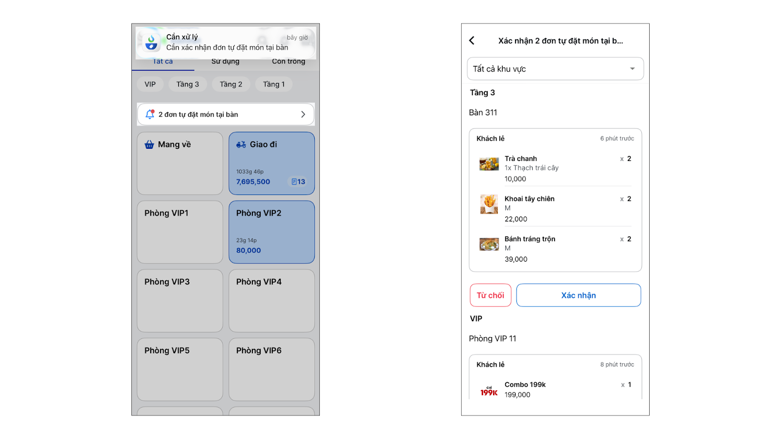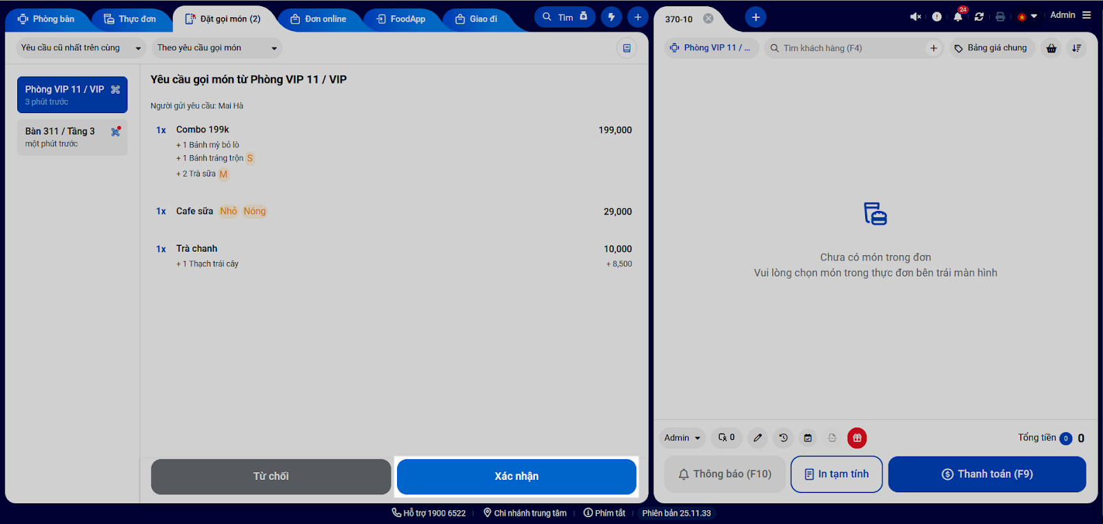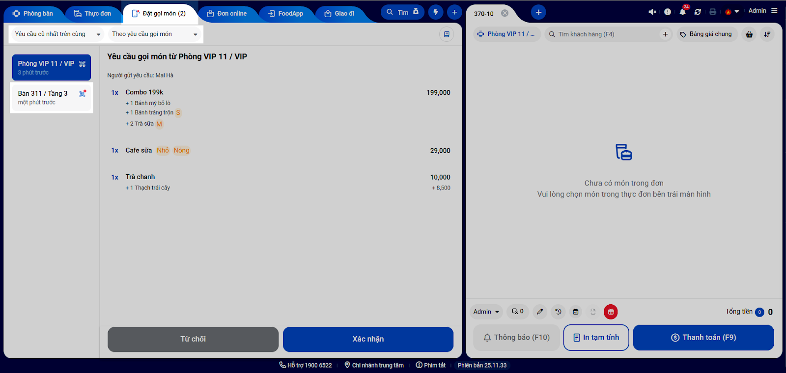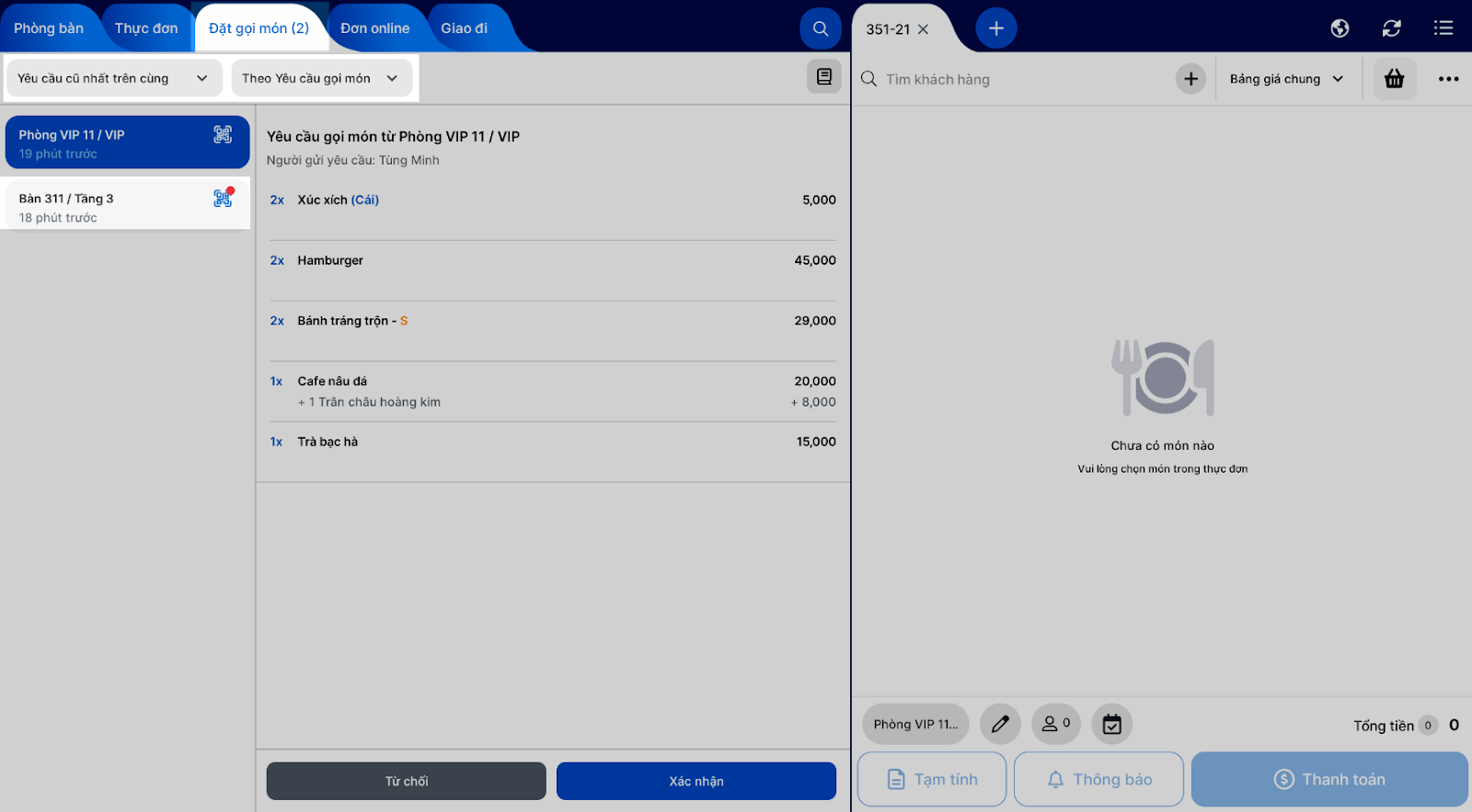 - Tích hợp liền mạch: Yêu cầu gọi món của khách được gửi thẳng đến màn hình Thu ngân (tab Đặt gọi món) để nhân viên xác nhận và báo bếp.