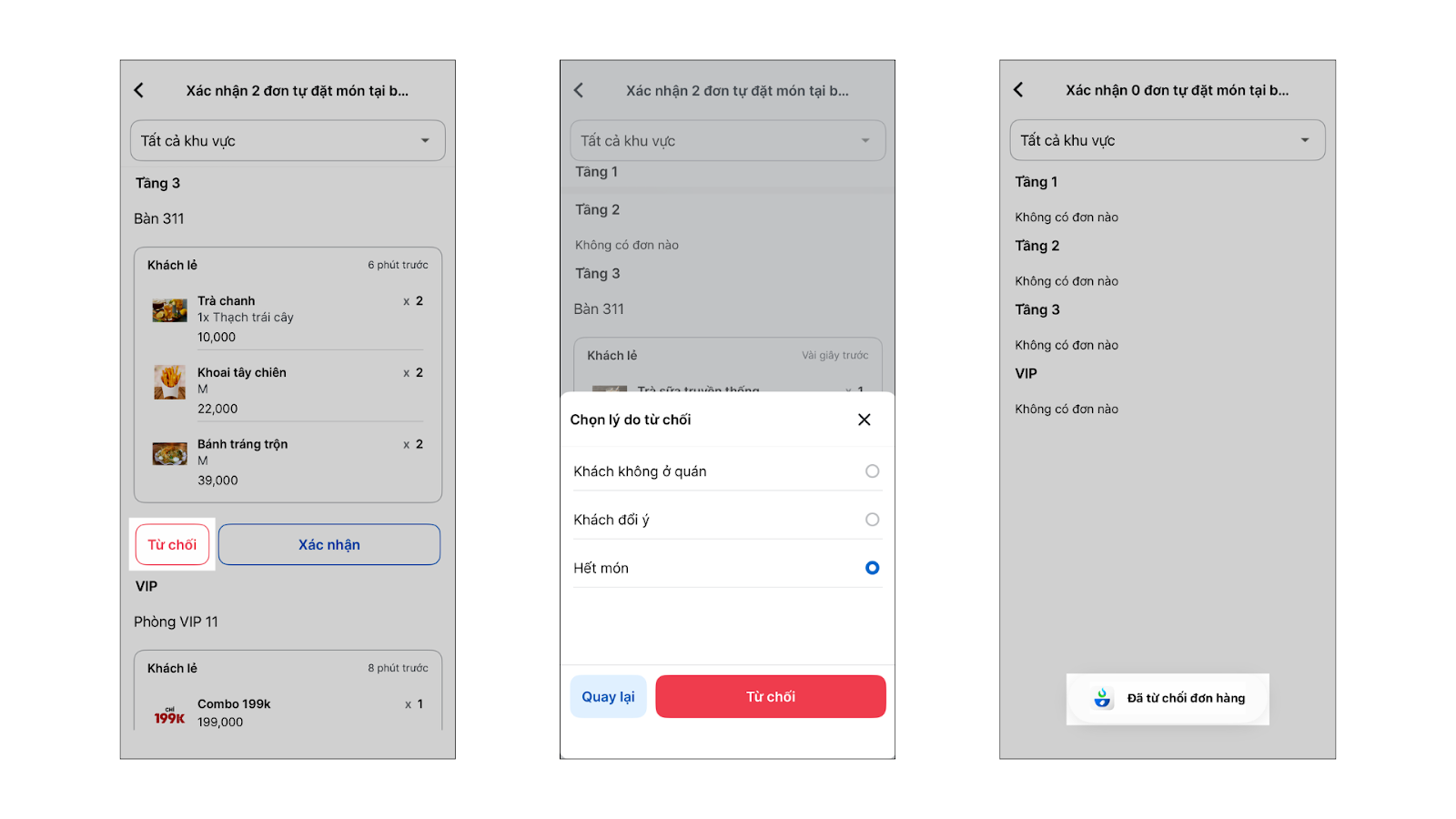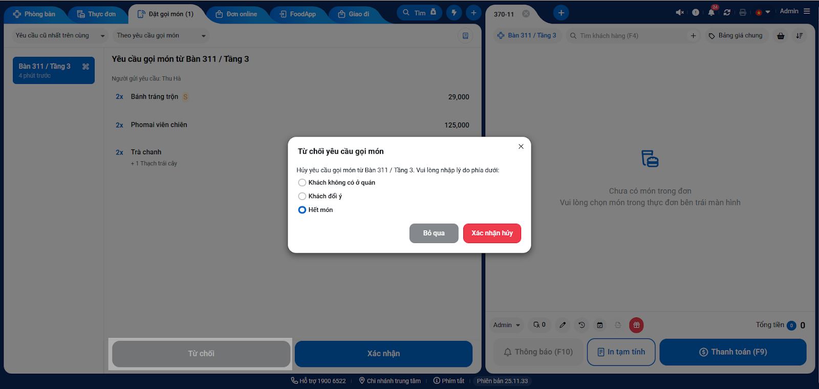 - Trên yêu cầu gọi món của bàn bạn nhấn Từ chối.
