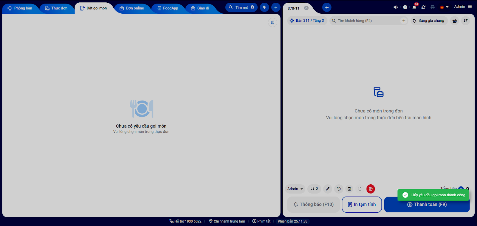 - Hệ thống hiển thị thông báo hủy thành công. (Nhân viên nên chủ động ra bàn thông báo lại cho khách).