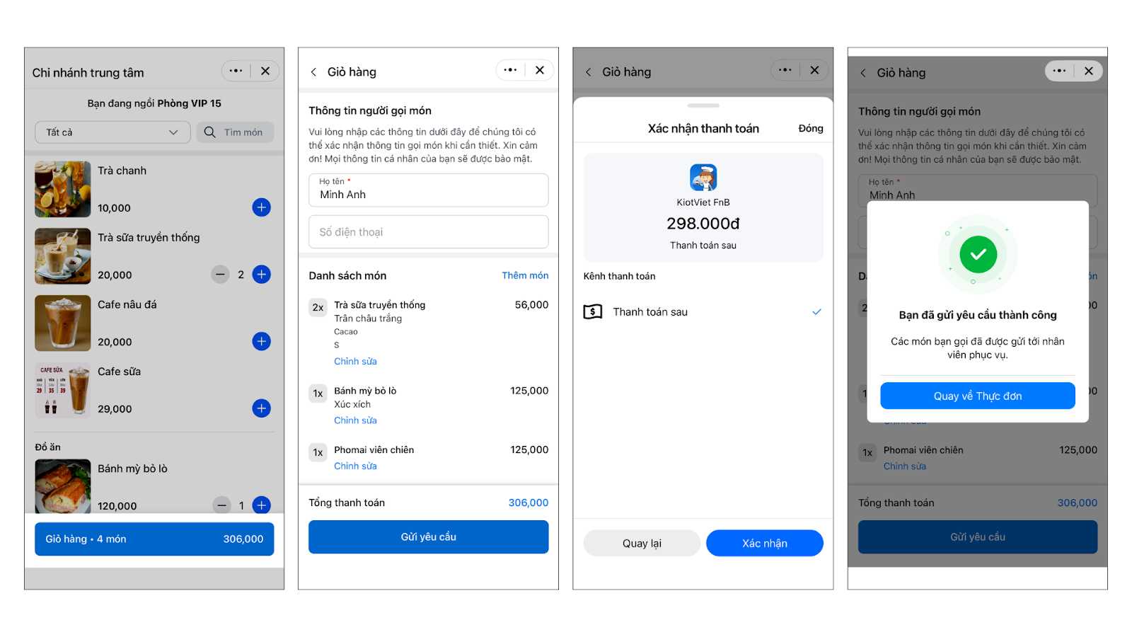- Tình huống: Sau khi chọn xong các món, khách hàng gửi yêu cầu đến quầy thu ngân/bếp.