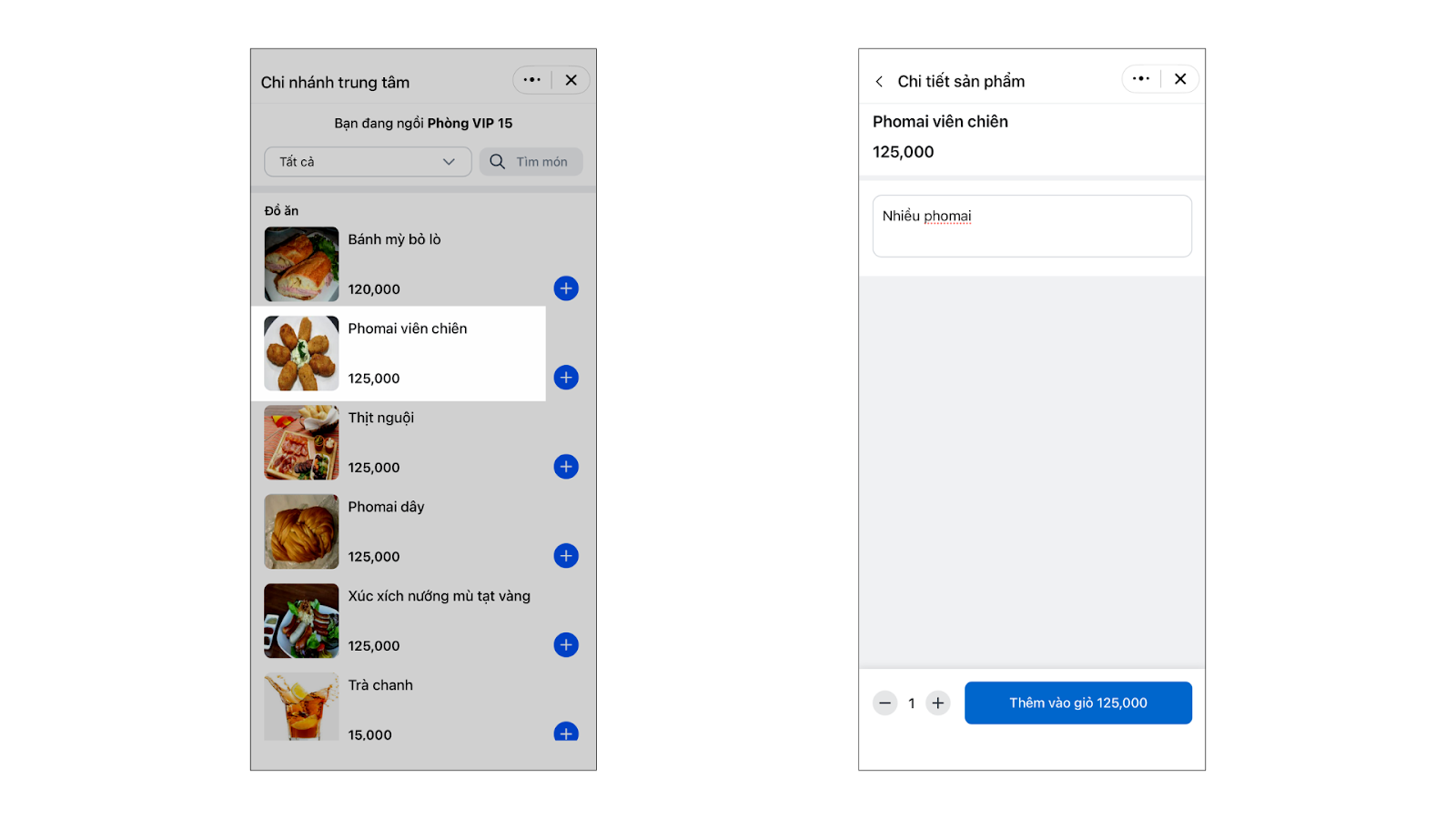 - Tình huống: Khách hàng chọn món “Bít tết” và muốn ghi chú “Chín vừa”, hoặc chọn “Trà sữa” và thêm topping “Trân châu”.