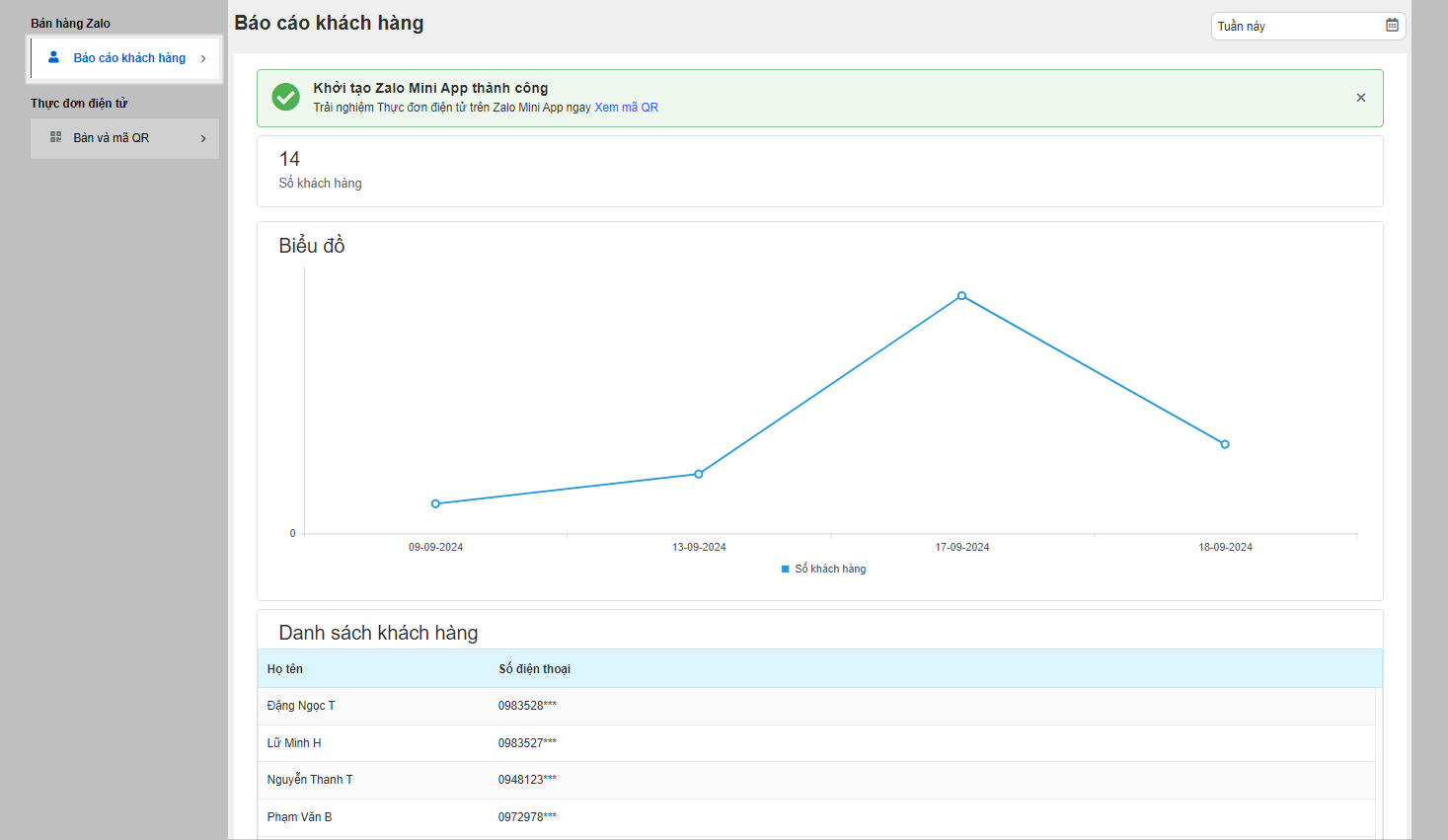 - Tình huống: Bạn muốn biết có bao nhiêu khách hàng mới đã gọi món qua Zalo trong tuần này.