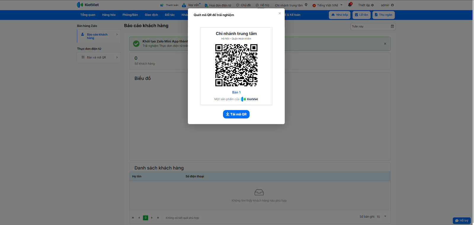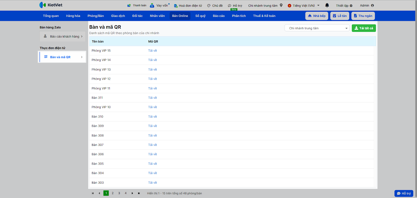 - Để khách hàng dễ dàng quét mã gọi món, bạn nhấn Tải về Mã QR cho từng bàn.