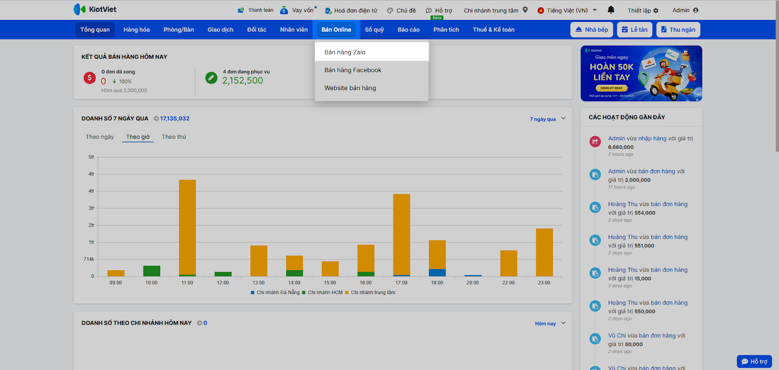 - Tài khoản Admin của chủ gian hàng truy cập màn hình Quản lý, từ menu Bán Online, chọn Bán hàng Zalo.