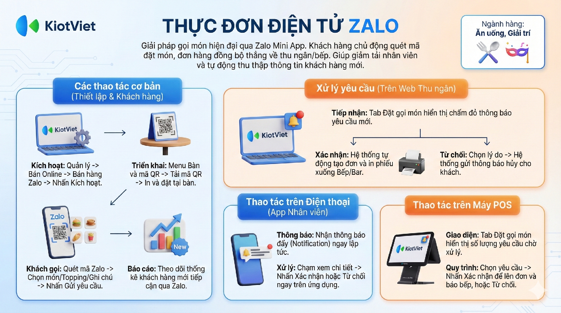 KiotViet cung cấp tính năng thực đơn điện tử trên Zalo Mini App để khách hàng (thực khách) của gian hàng có thể chủ động quét mã QR xem thực đơn và thực hiện gọi món ngay tại phòng/bàn.
