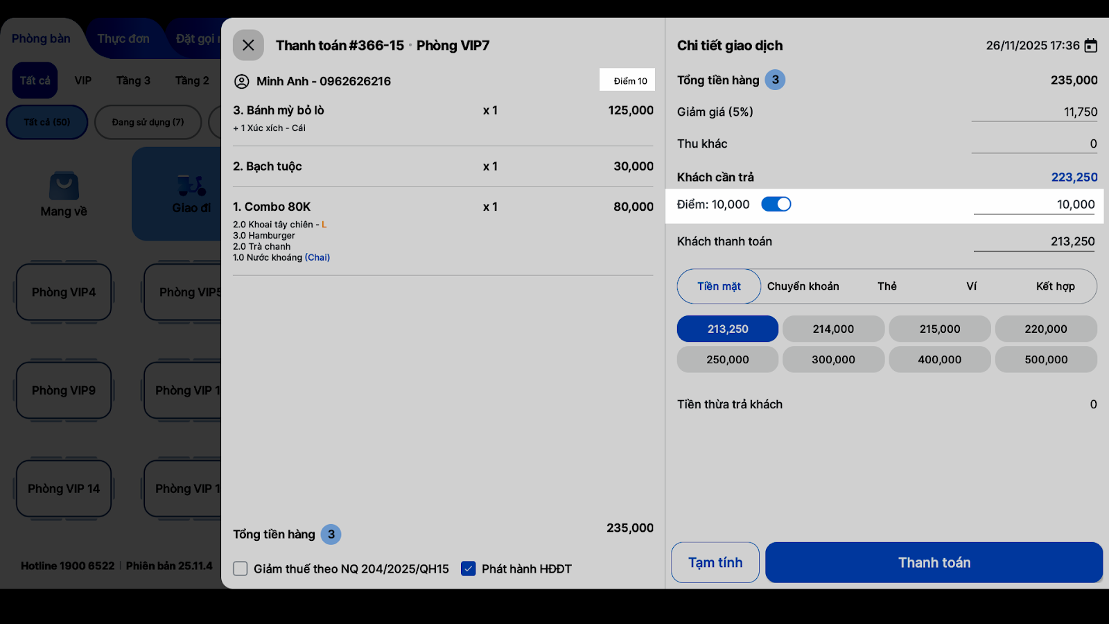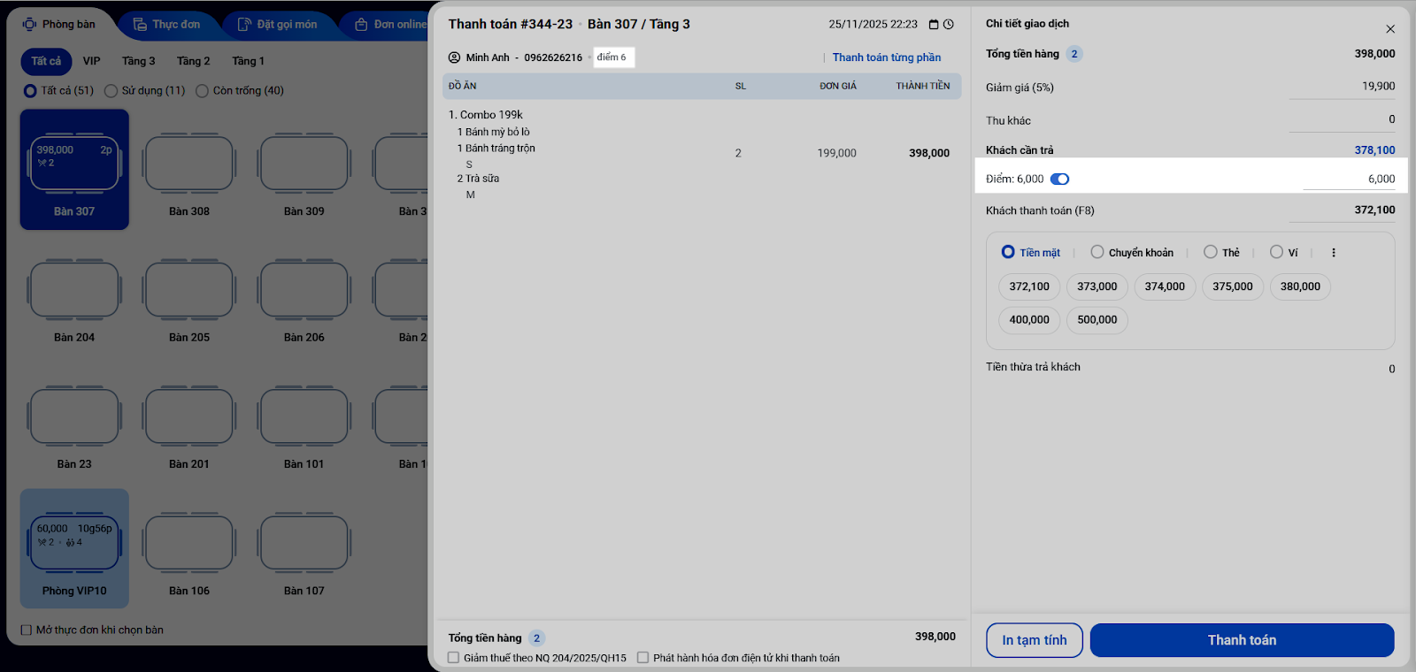 - Hoàn tất thanh toán. Hệ thống sẽ tự động trừ điểm của khách và ghi nhận giao dịch.