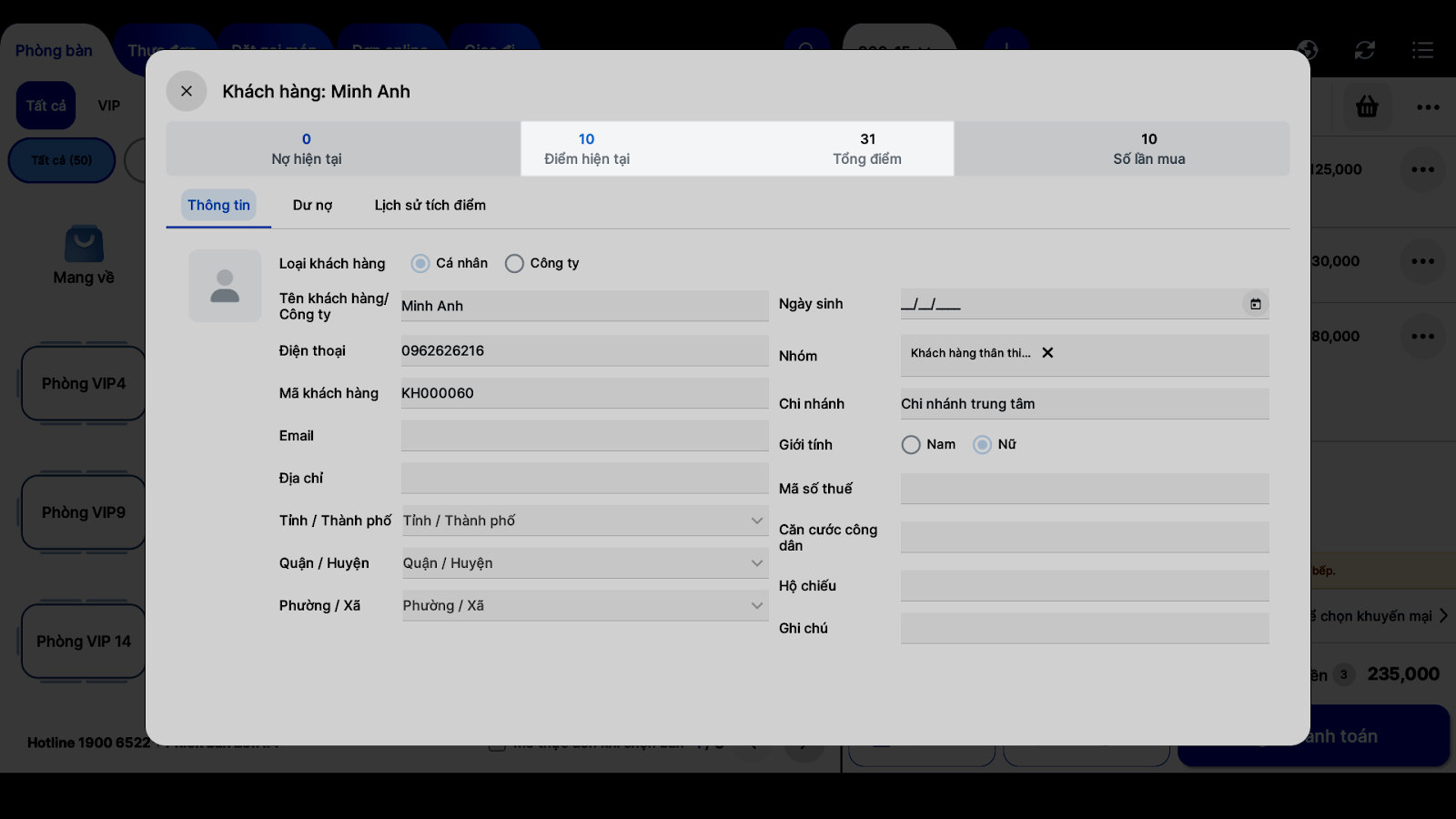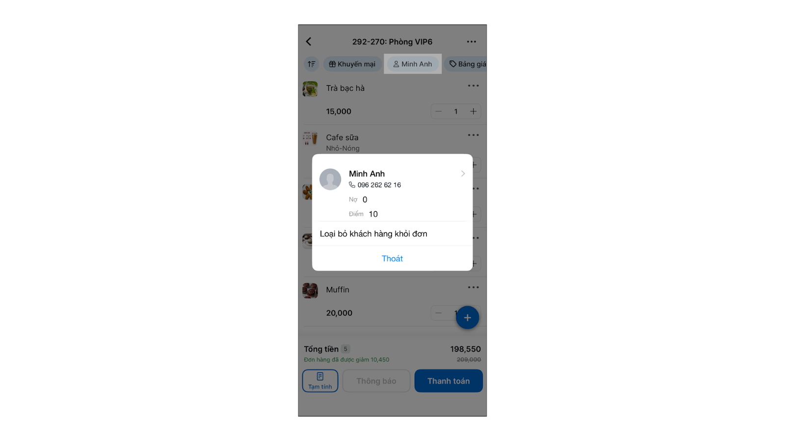- Tình huống: Khách hàng Minh Anh (đã có trong hệ thống) đến thanh toán. Nhân viên thu ngân cần chọn đúng khách hàng để hệ thống tự động cộng điểm cho hóa đơn này.