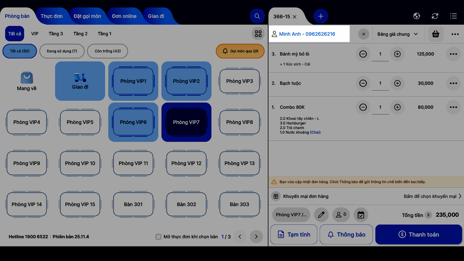 - Sau khi đã chọn món và chọn khách hàng → nhấn nút Thanh toán.