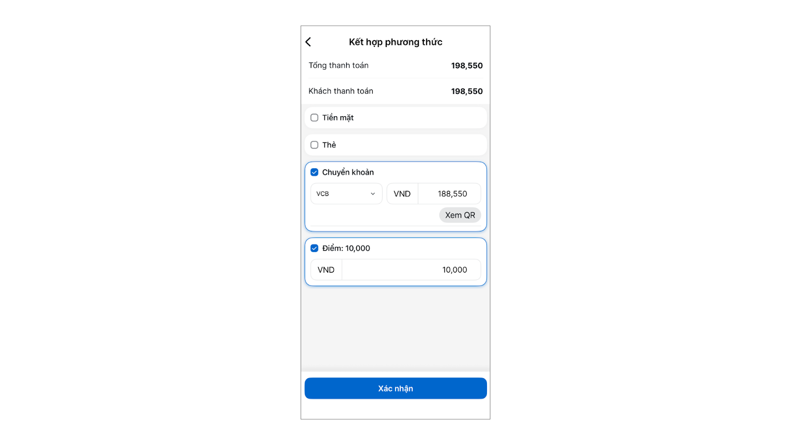 - Bạn chọn hình thức Kết hợp → tích chọn Điểm → ứng dụng mặc định số tiền tương ứng số điểm của khách, bạn có thể chỉnh sửa.