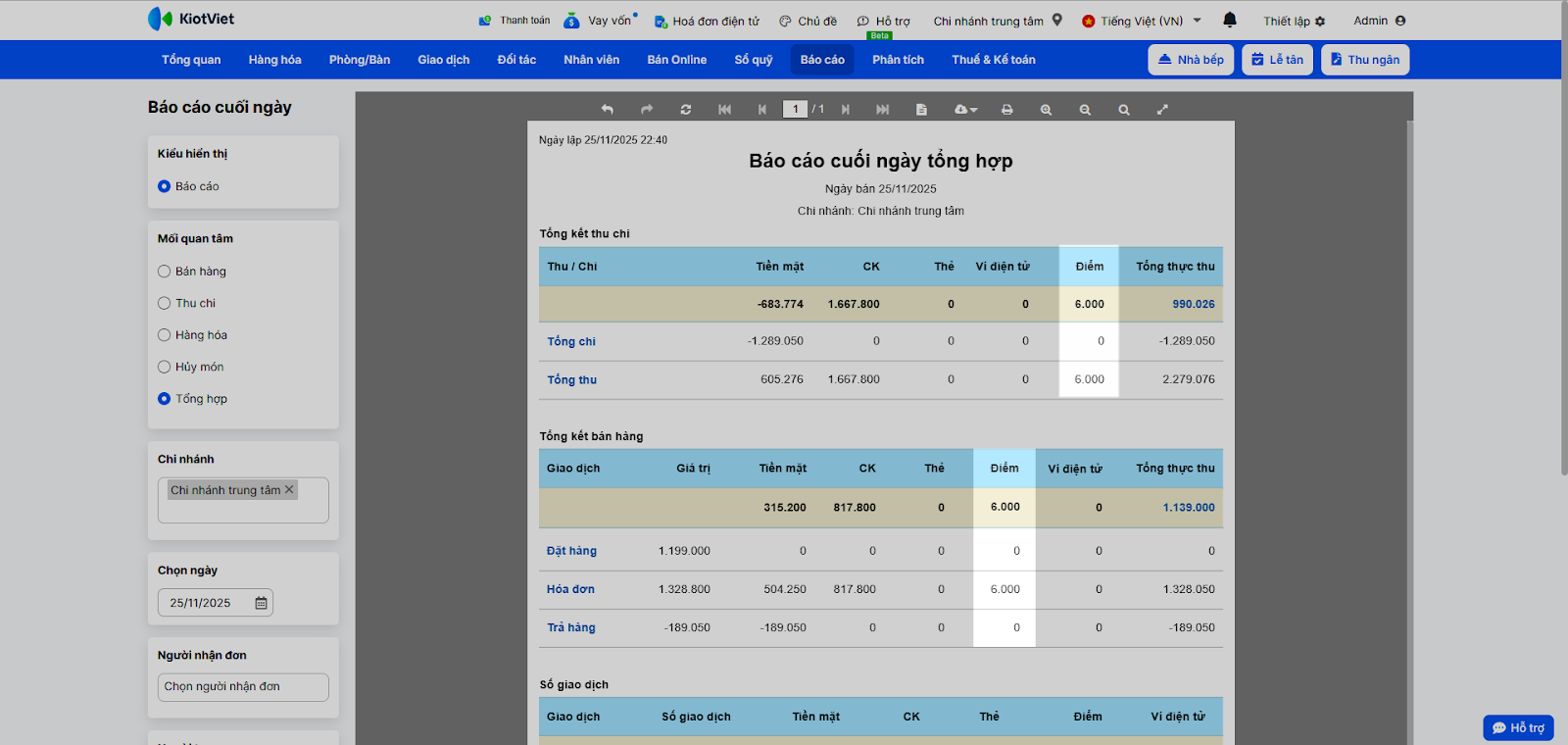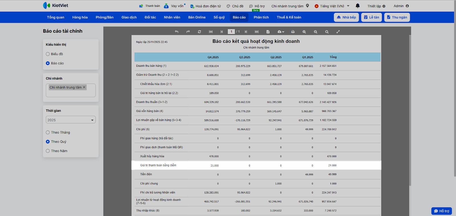 - Báo cáo sẽ hiển thị giá trị điểm khách hàng đã sử dụng.