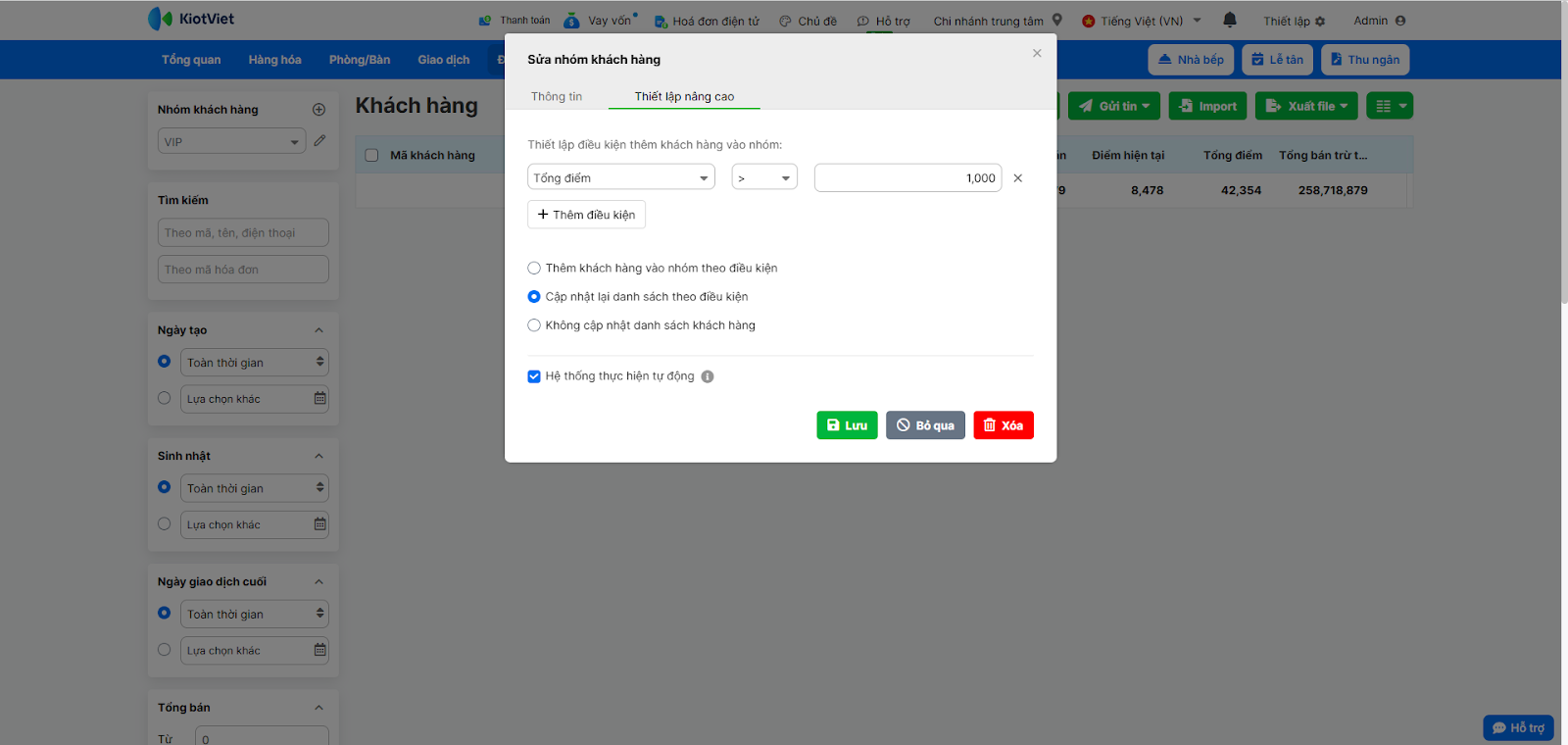 - Chọn Thêm khách hàng vào nhóm theo điều kiện hoặc Cập nhật lại danh sách theo điều kiện.