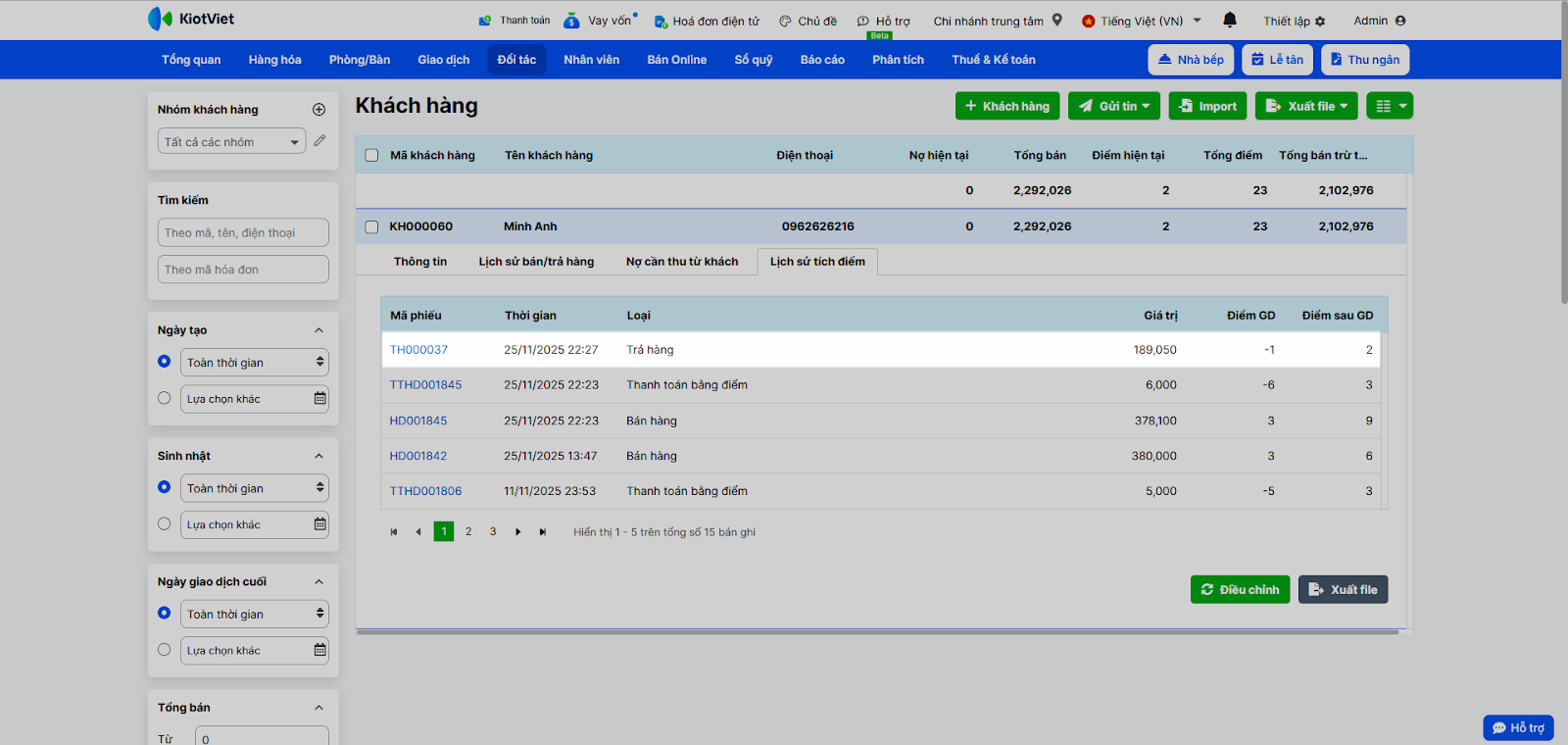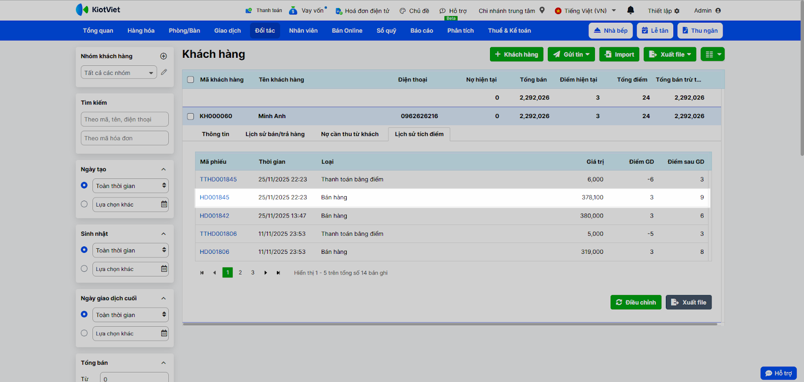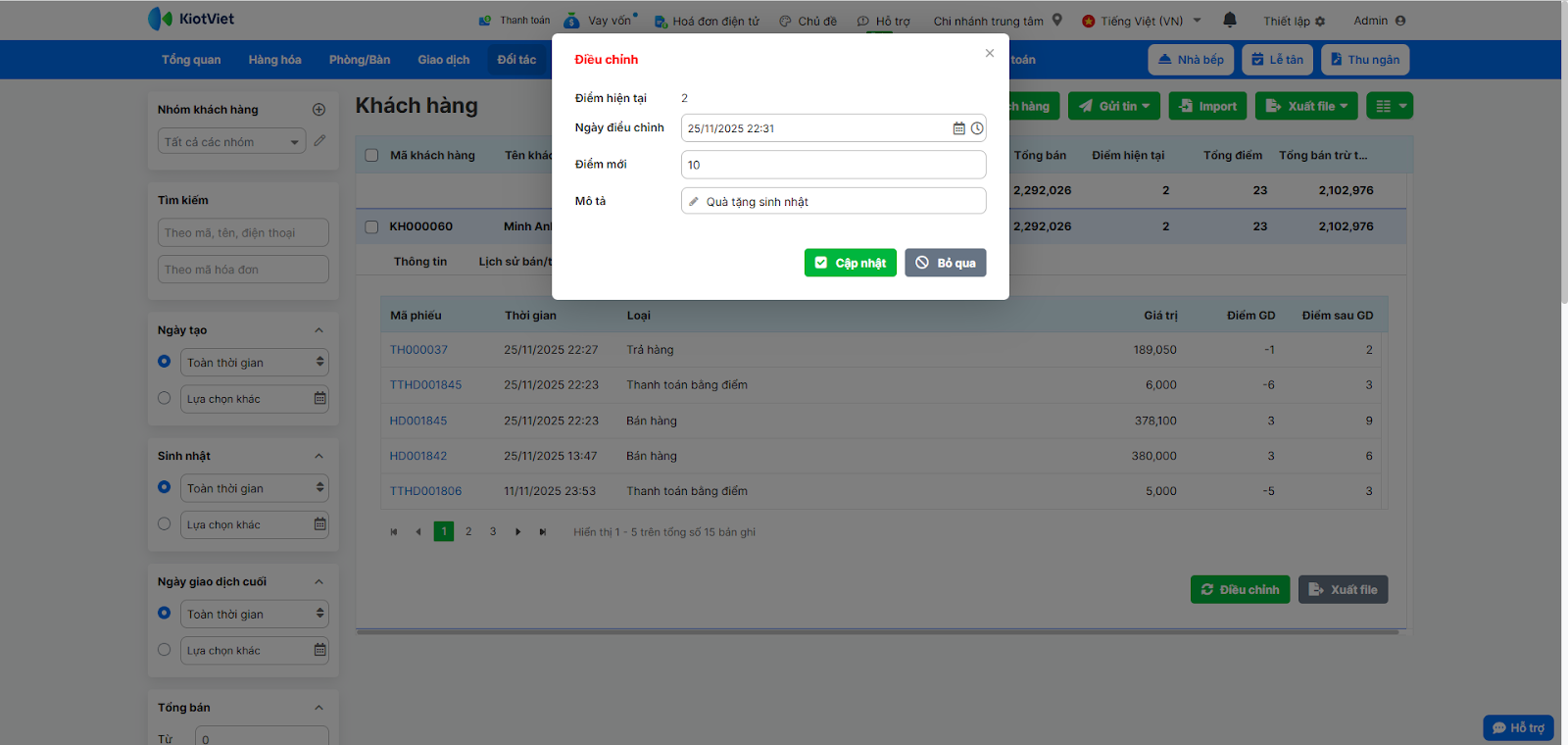 - Tình huống: Bạn muốn kiểm tra lịch sử tích điểm của một khách hàng VIP, hoặc cộng tặng 100 điểm cho khách hàng nhân dịp sinh nhật.