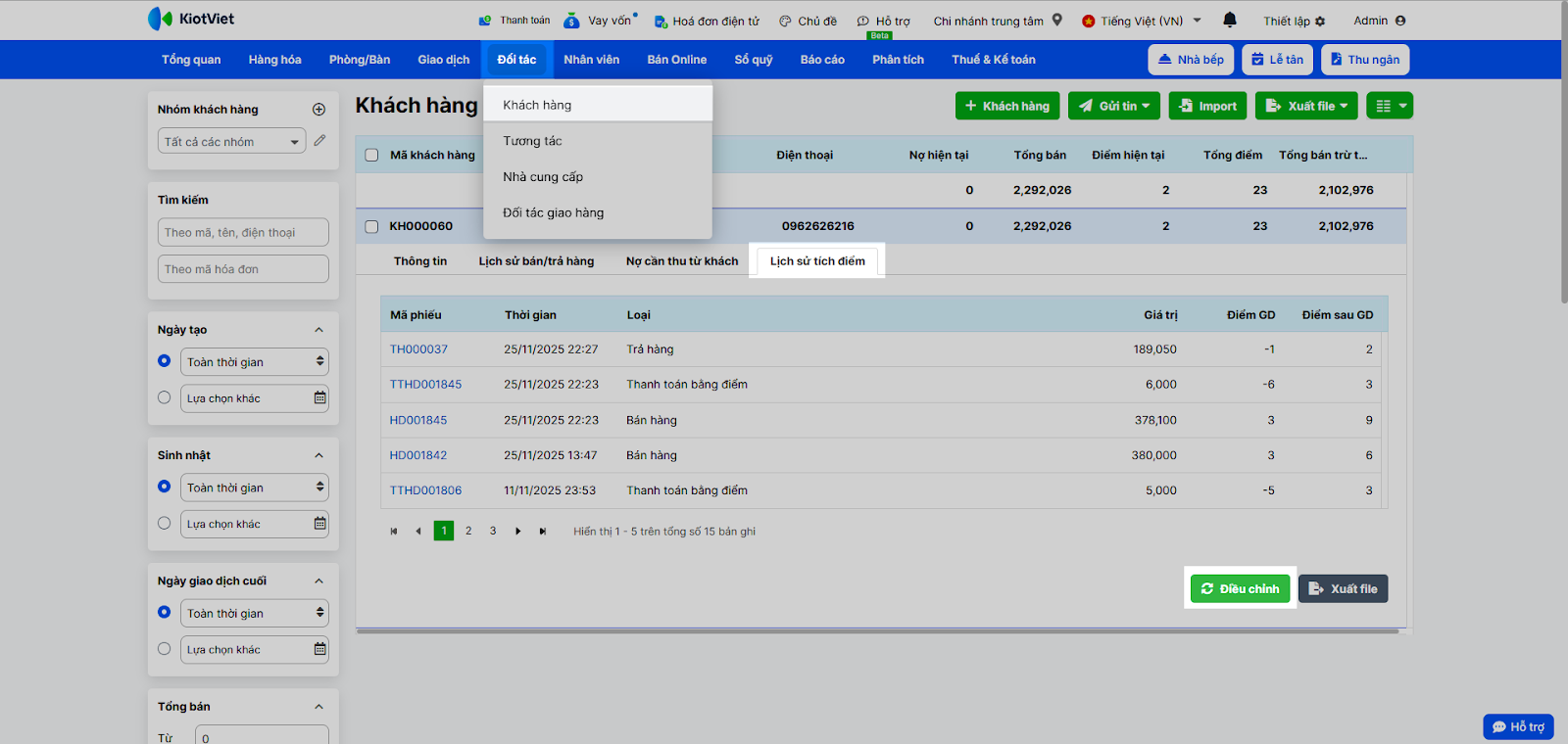 - Nhấn nút Điều chỉnh (Yêu cầu tài khoản của bạn được cấp quyền Đối tác → Tích điểm KH → Cập nhật).