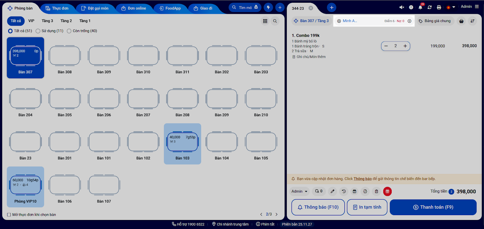 - Sau khi đã chọn món và chọn khách hàng → nhấn Thanh toán.