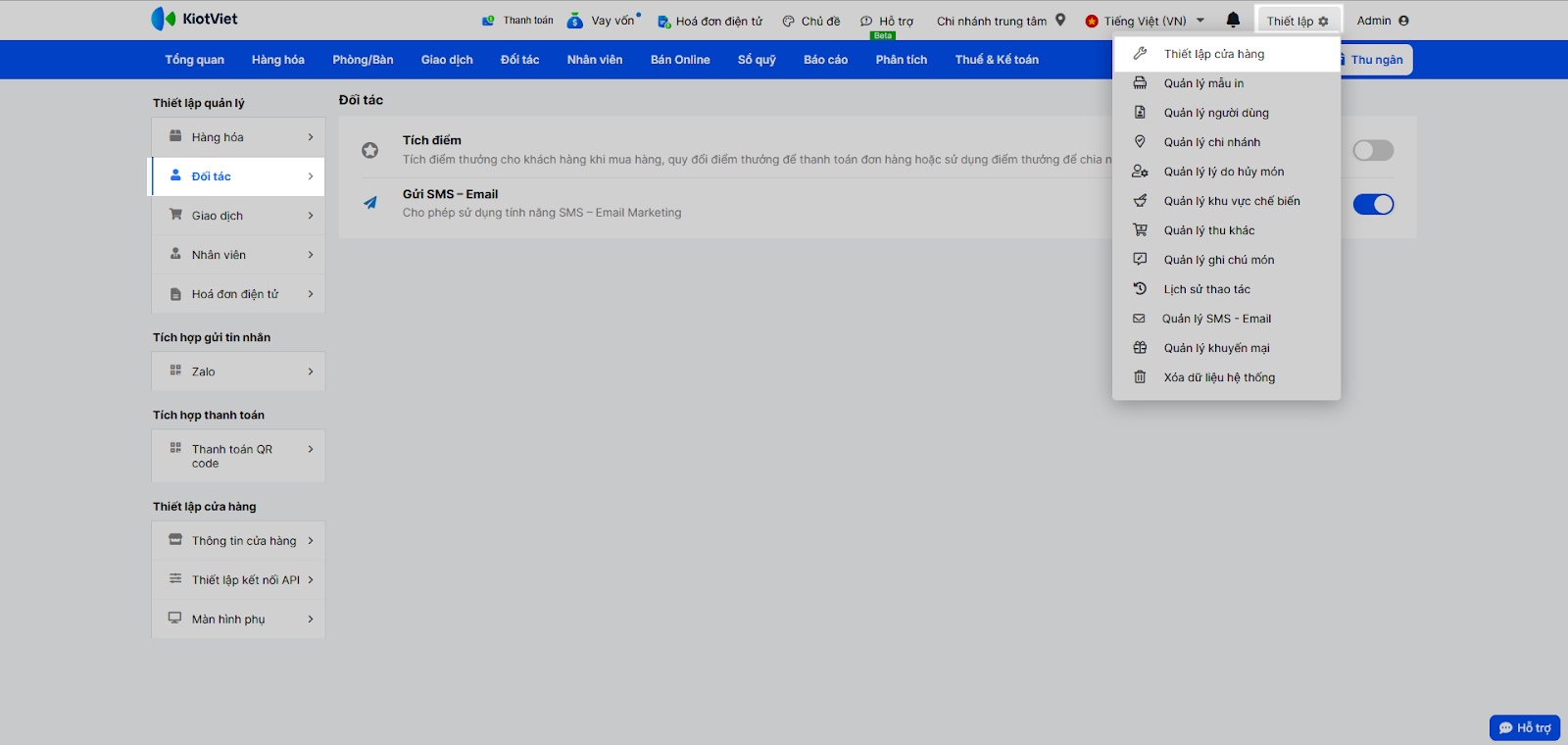 - Chọn Đối tác trong mục “Thiết lập quản lý”.