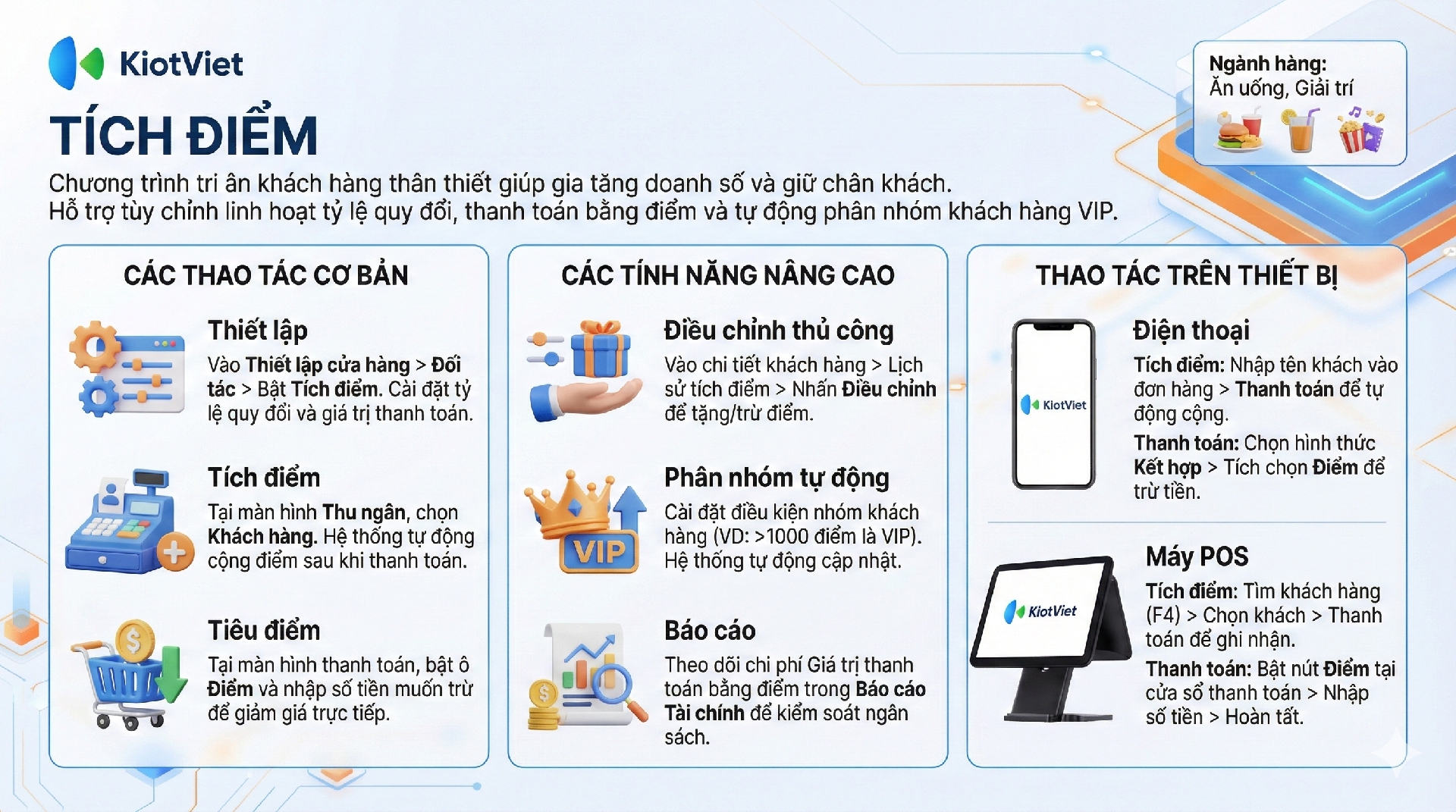 Tính năng Tích điểm trên KiotViet Máy POS Nhà hàng hỗ trợ cửa hàng thực hiện các thao tác: tích điểm và thanh toán bằng điểm.