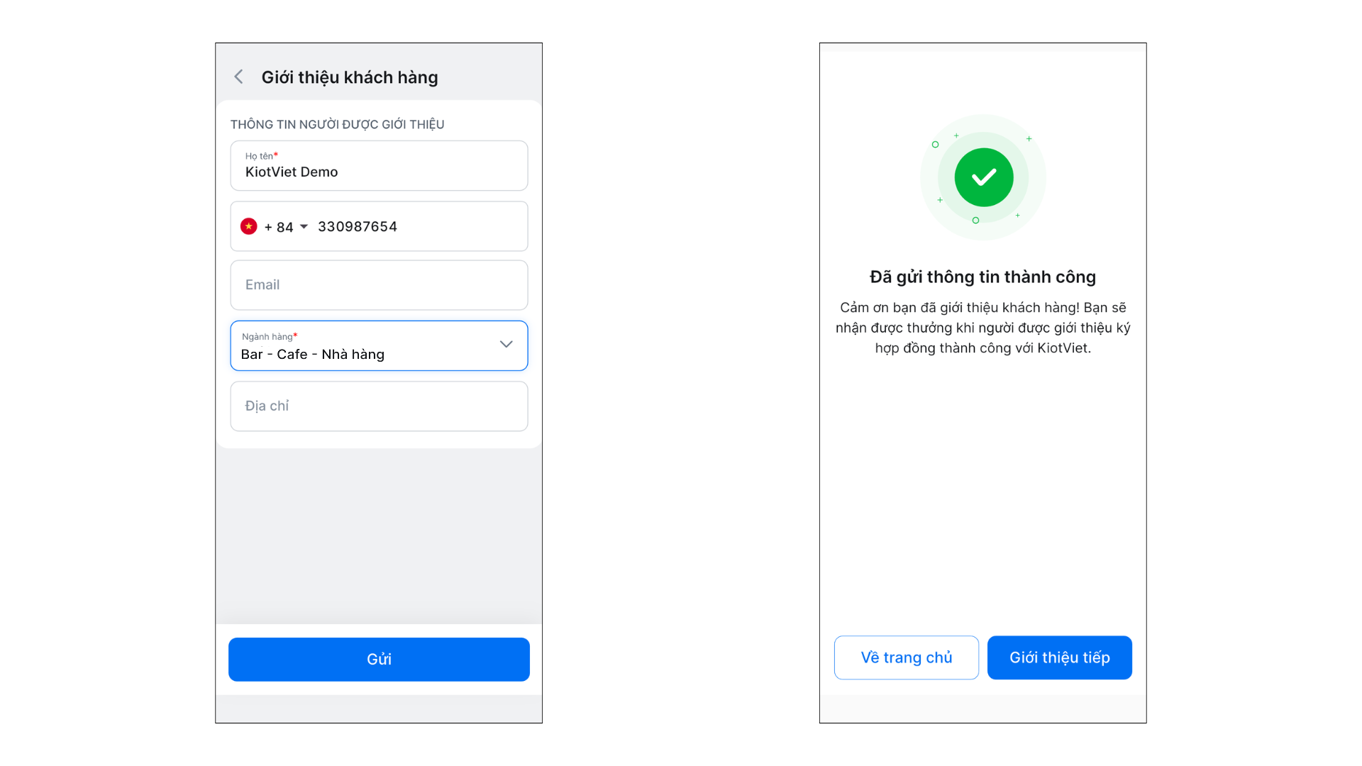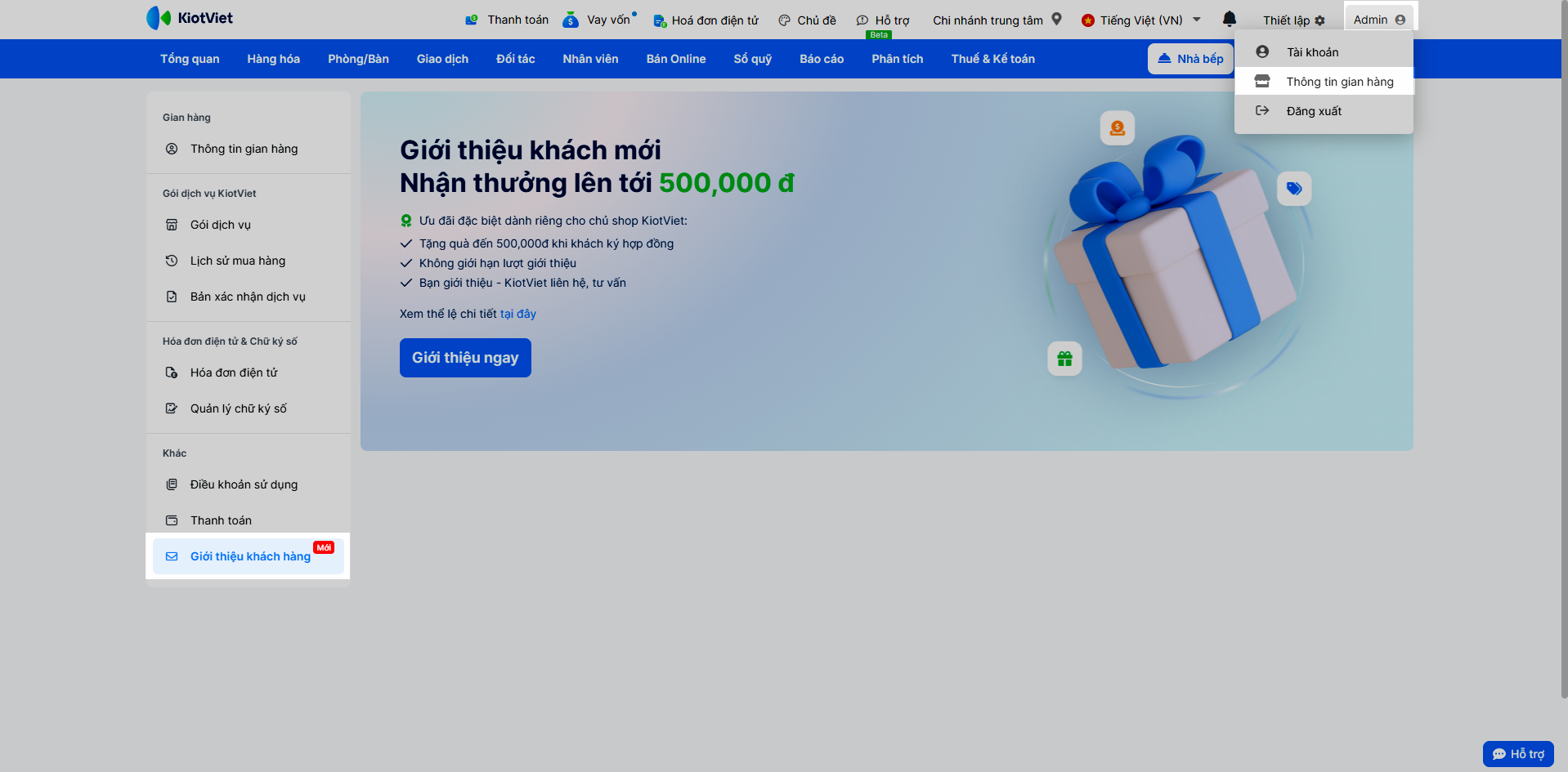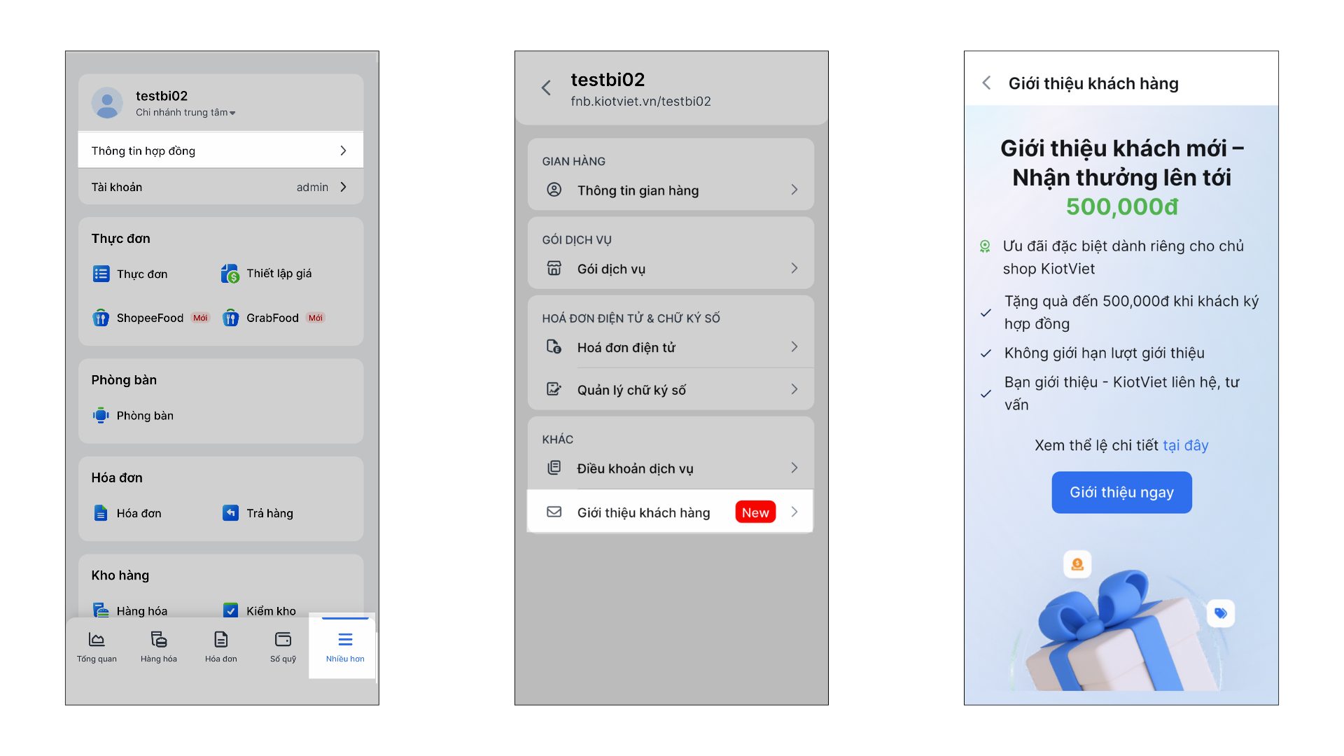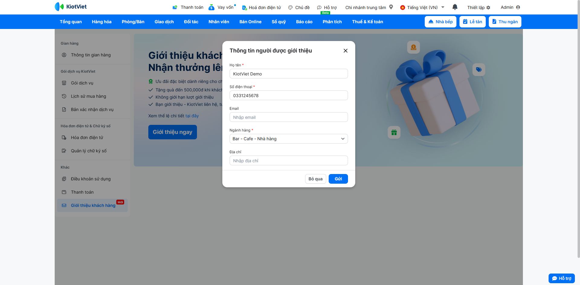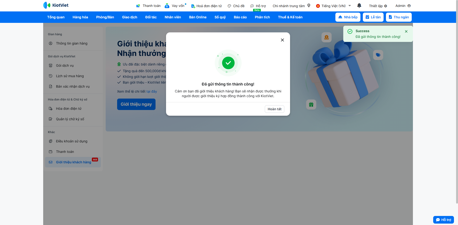 Tính năng này cho phép các khách hàng đang sử dụng KiotViet giới thiệu khách hàng mới và nhận thưởng lên đến 500.000đ khi người được giới thiệu ký hợp đồng thành công. Bạn chỉ cần điền thông tin, KiotViet sẽ đảm nhận việc liên hệ và tư vấn.