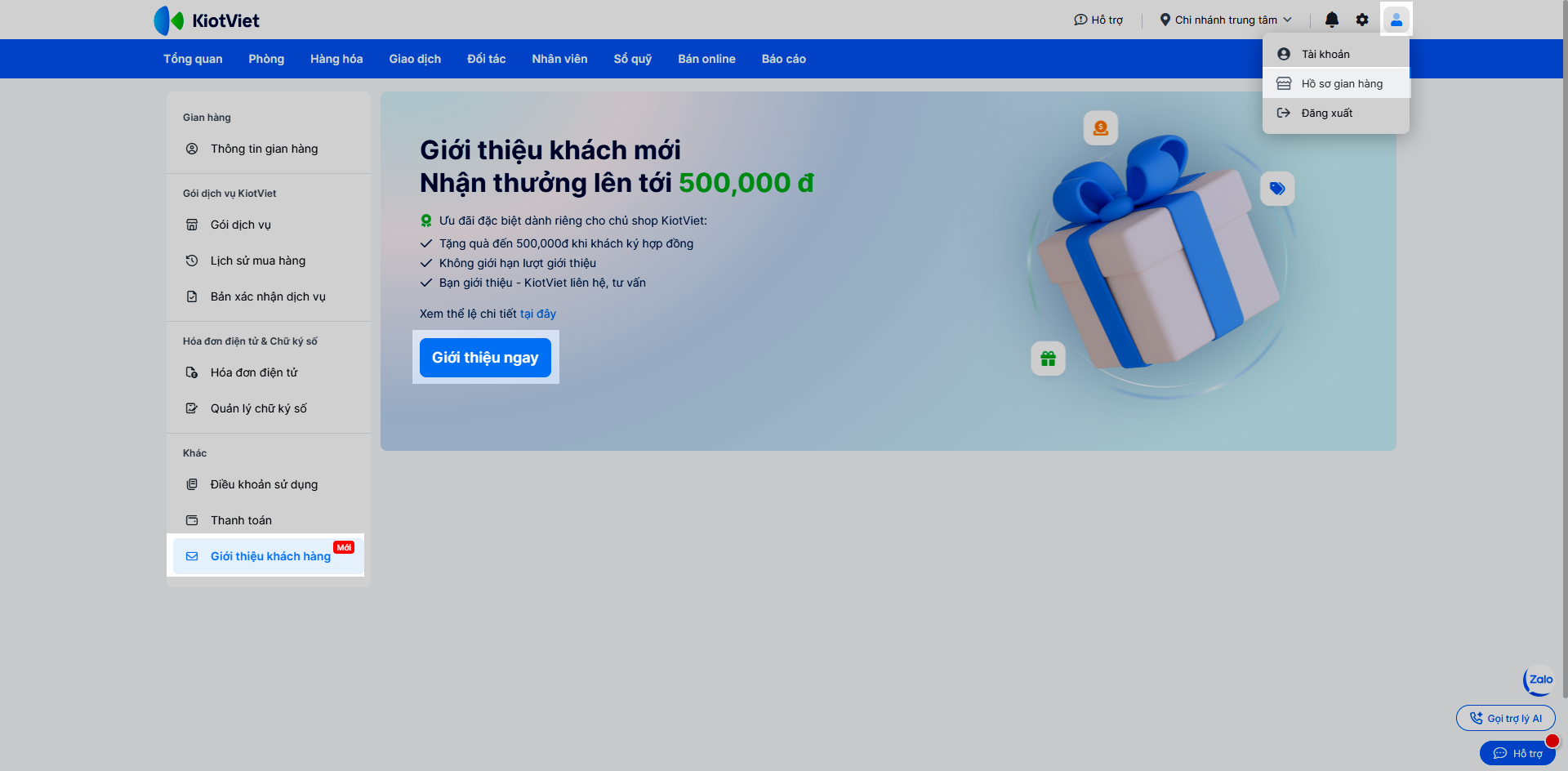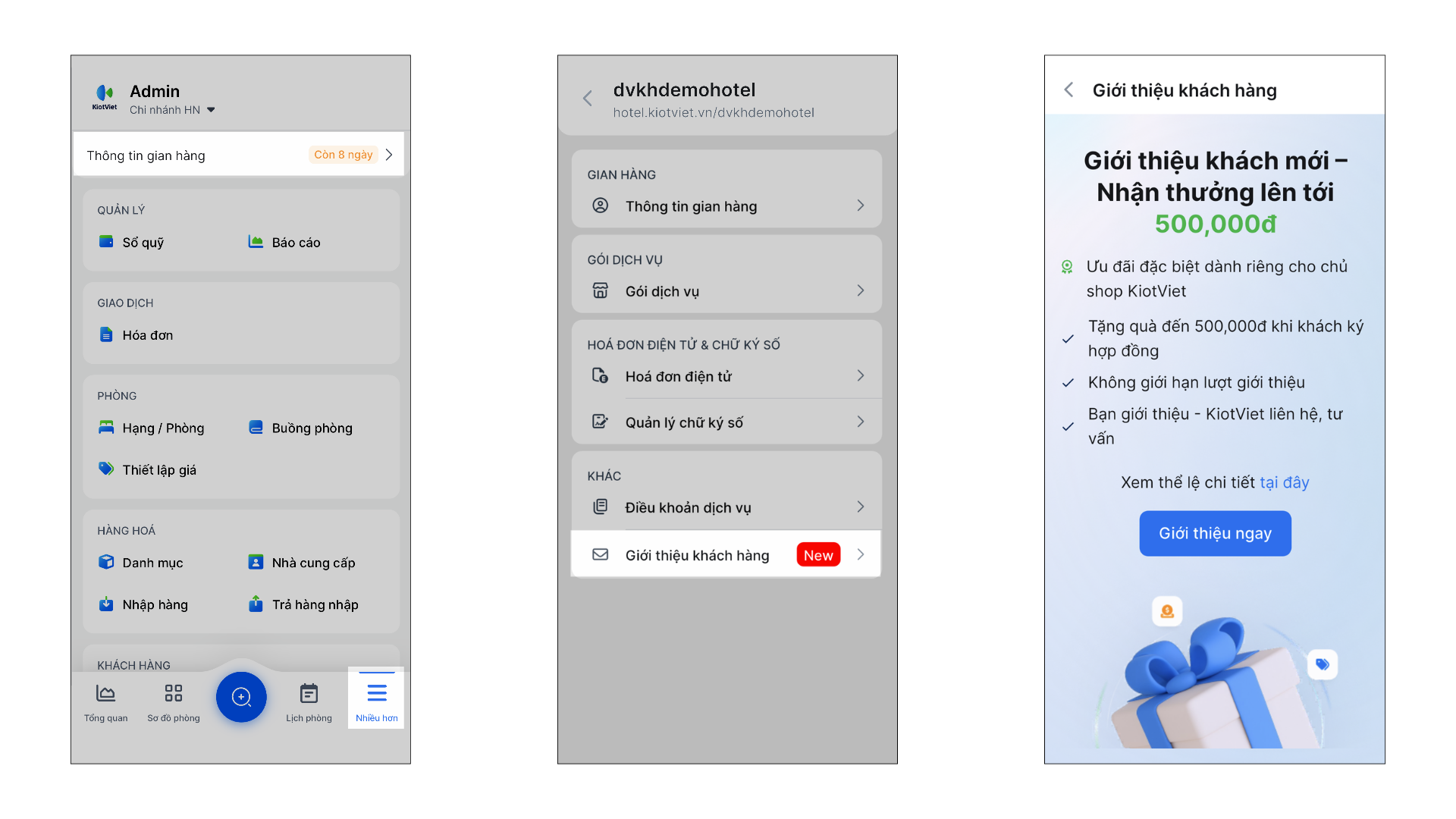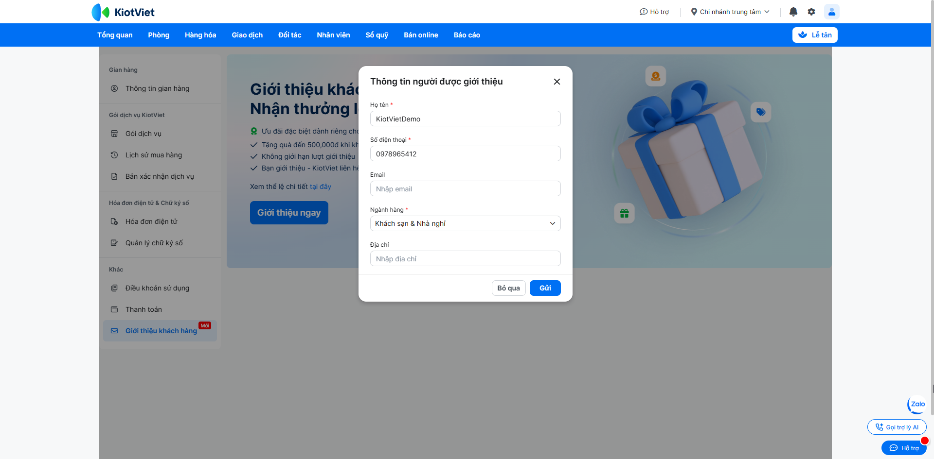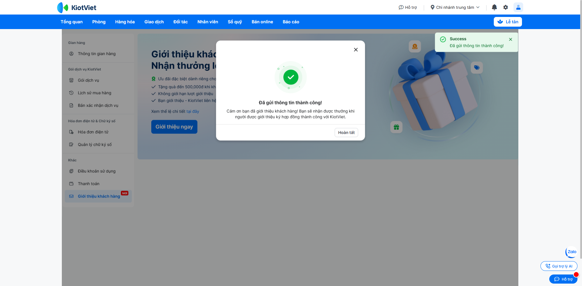 Tính năng này cho phép các khách hàng đang sử dụng KiotViet giới thiệu khách hàng mới và nhận thưởng lên đến 500.000đ khi người được giới thiệu ký hợp đồng thành công. Bạn chỉ cần điền thông tin, KiotViet sẽ đảm nhận việc liên hệ và tư vấn.
