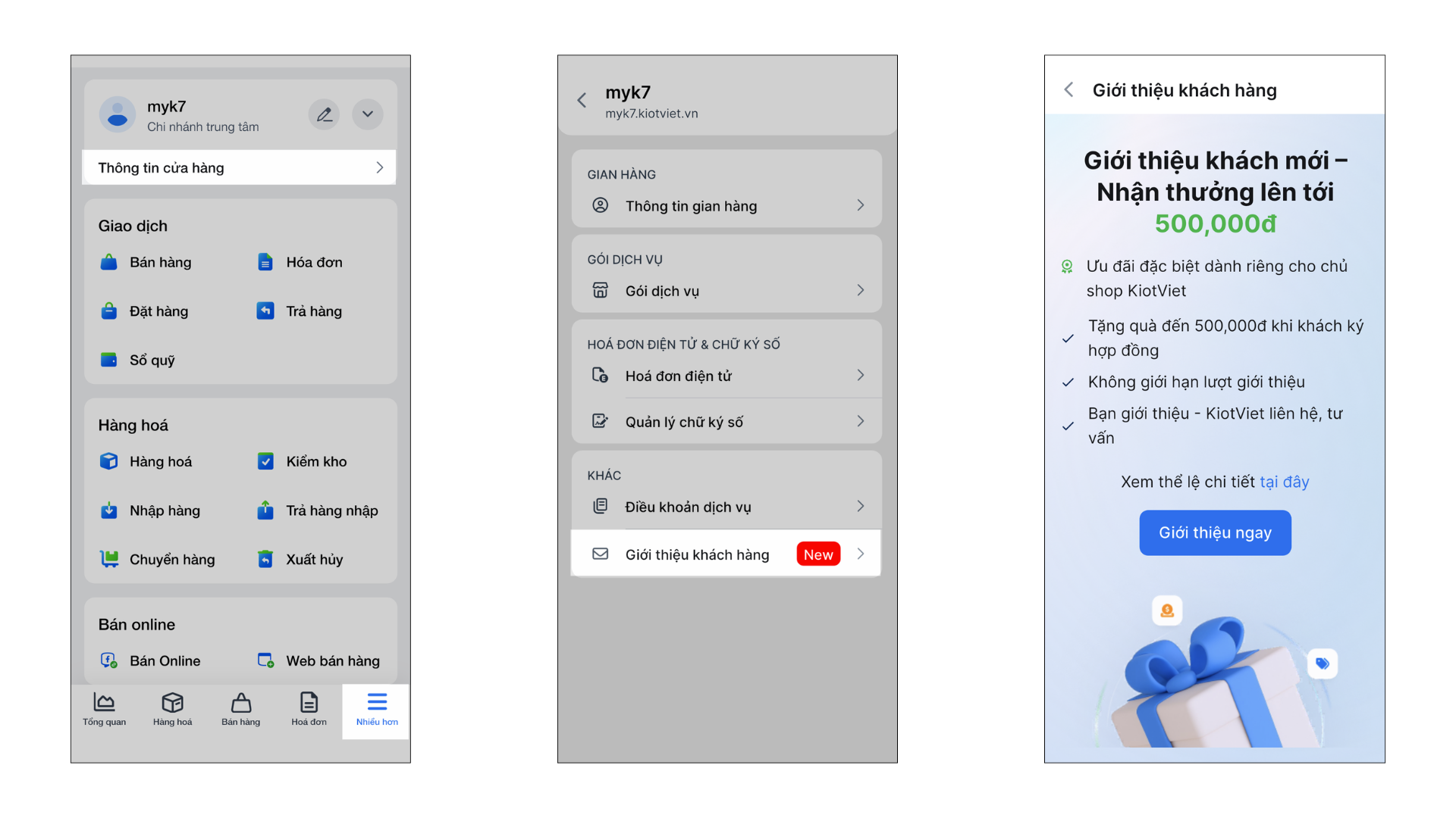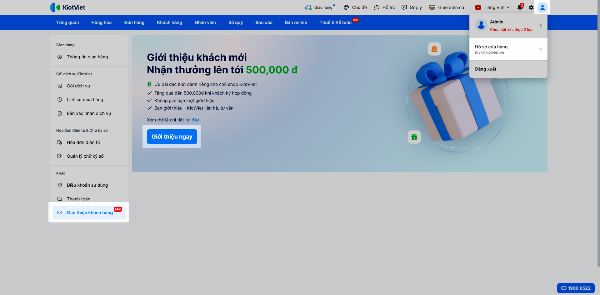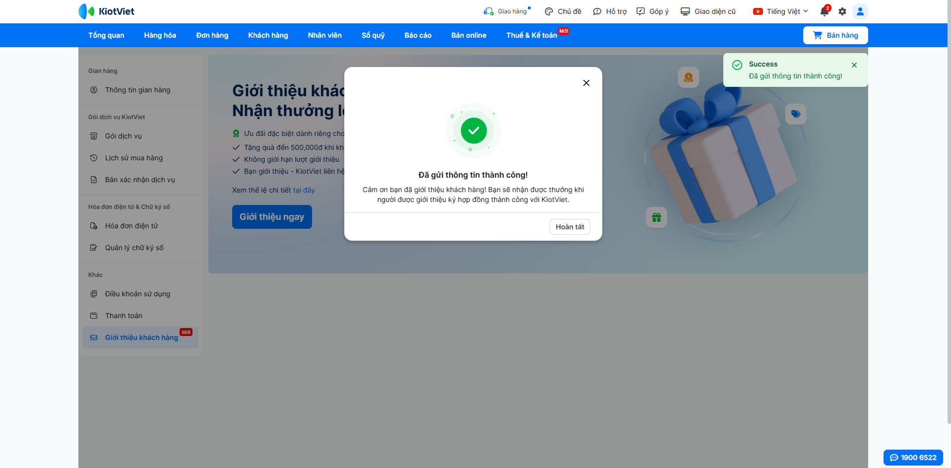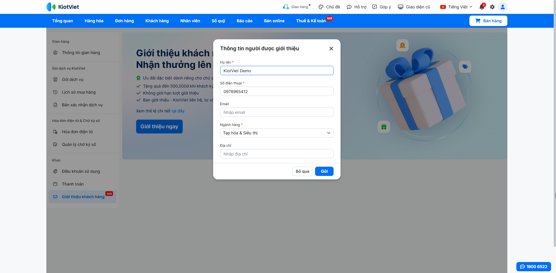 Tính năng này cho phép các khách hàng đang sử dụng KiotViet giới thiệu khách hàng mới và nhận thưởng lên đến 500.000đ khi người được giới thiệu ký hợp đồng thành công. Bạn chỉ cần điền thông tin, KiotViet sẽ đảm nhận việc liên hệ và tư vấn.
