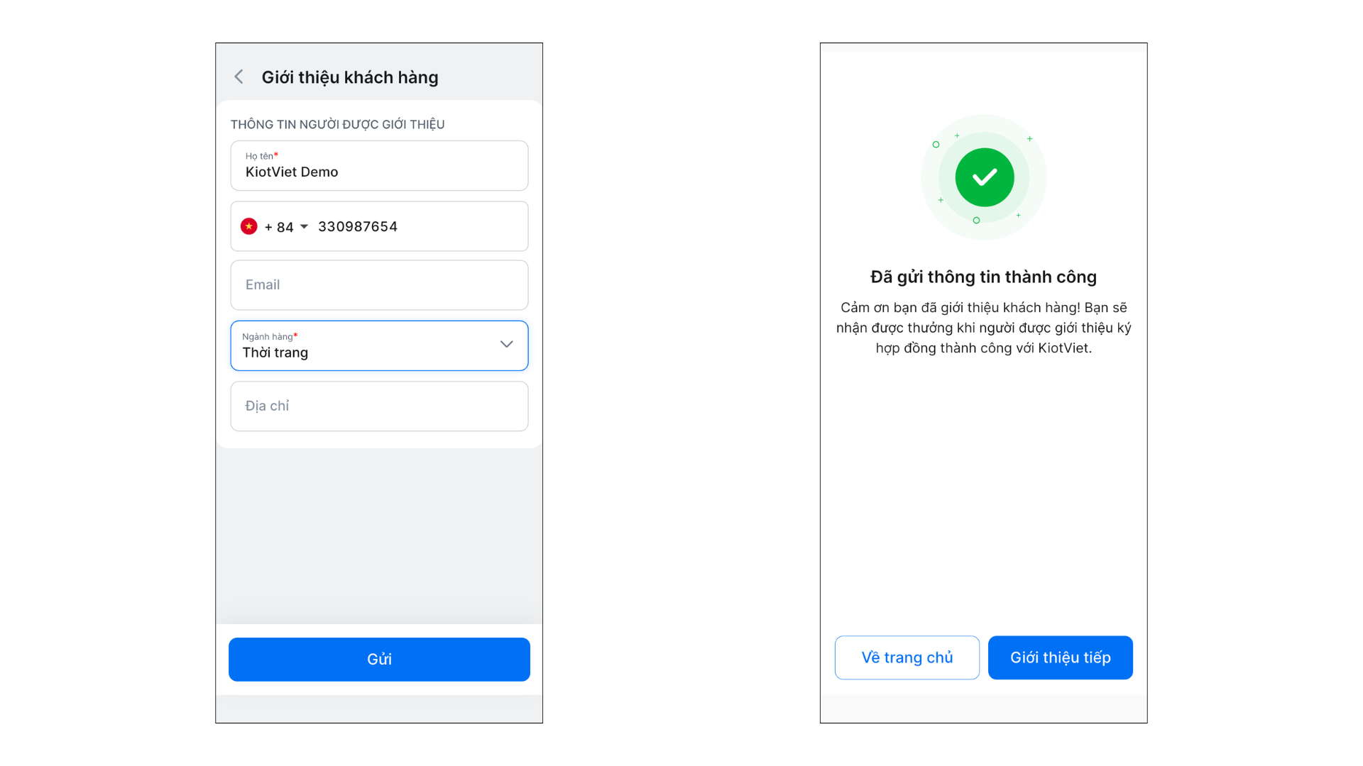 Phần này sẽ tóm tắt các thao tác chính bạn cần thực hiện trên phiên bản Website để giới thiệu một khách hàng mới, từ việc truy cập tính năng cho đến khi gửi thông tin thành công.