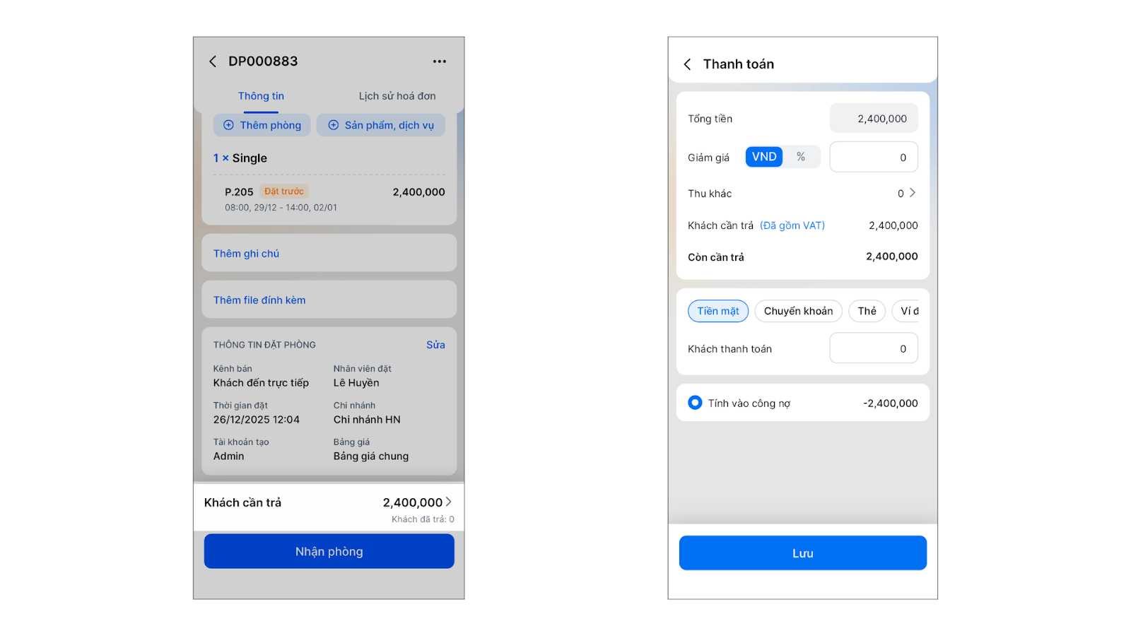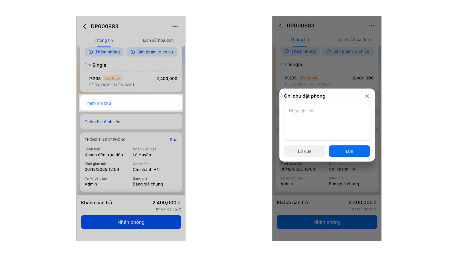 - Khi xem chi tiết đặt phòng đang ở trạng thái Đang sử dụng hoặc Đã trả (nhưng chưa thanh toán hết hóa đơn).