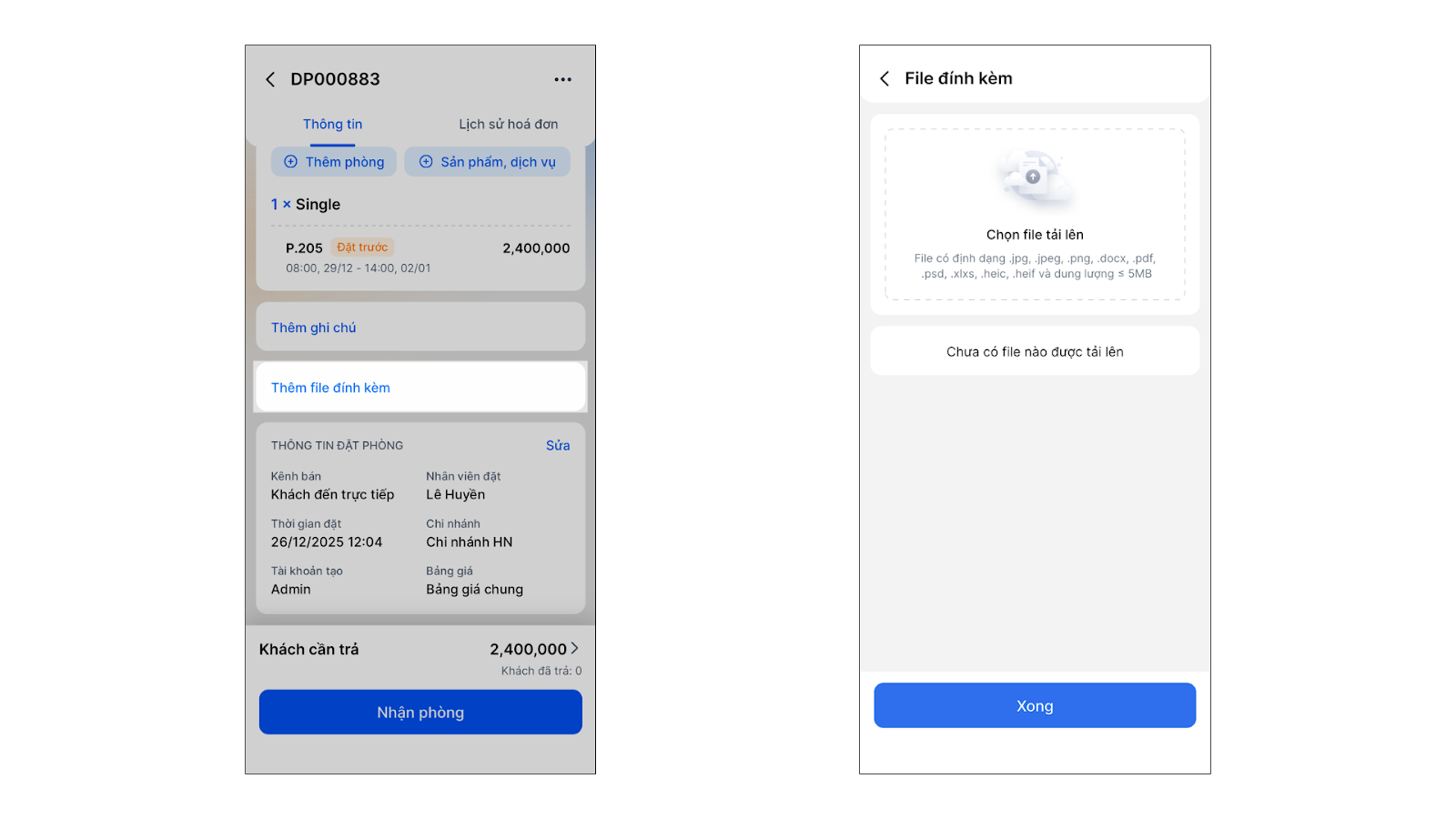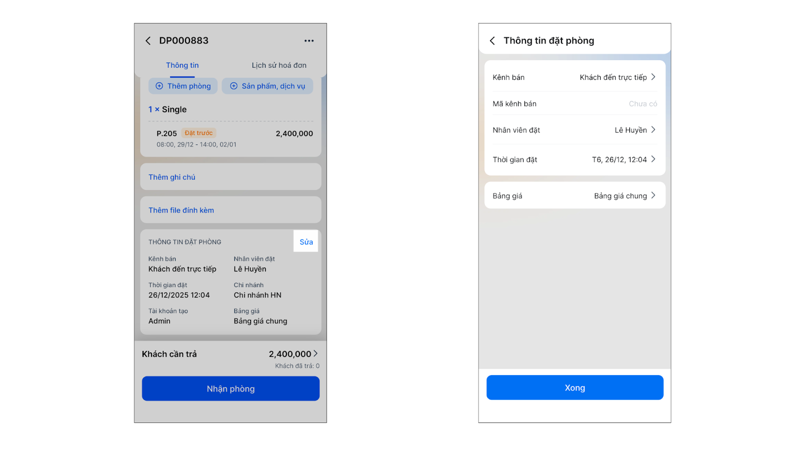 - Thao tác thực hiện như sau: Tại màn hình chi tiết đặt phòng, chạm vào các thông tin cần sửa → nhấn Xong. Bao gồm: