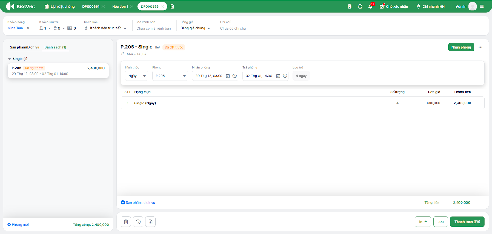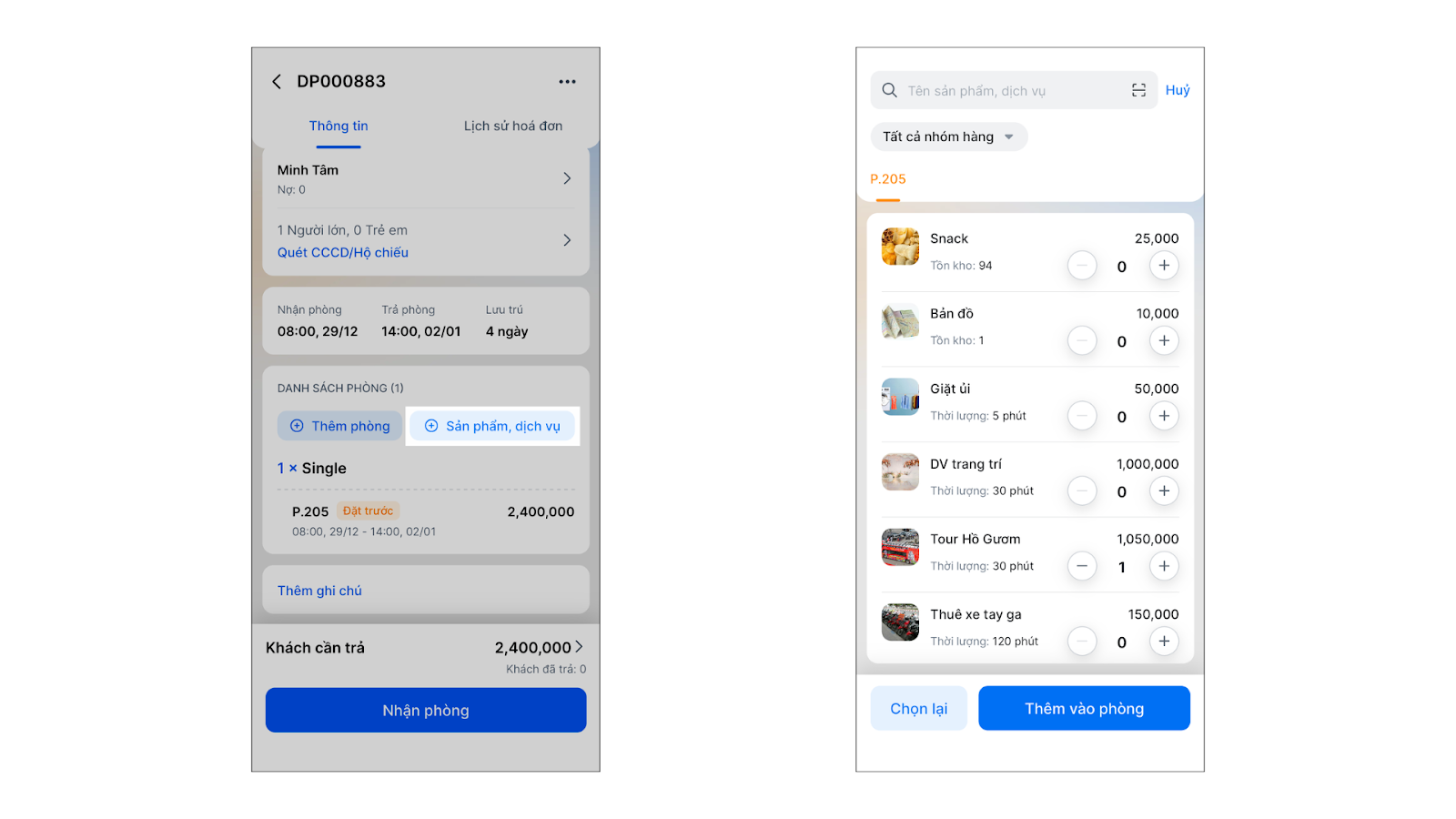 - Bổ sung sản phẩm, dịch vụ: Tìm kiếm và thêm các mặt hàng/dịch vụ (như giặt là, nước uống, ăn sáng) vào từng phòng cụ thể.
