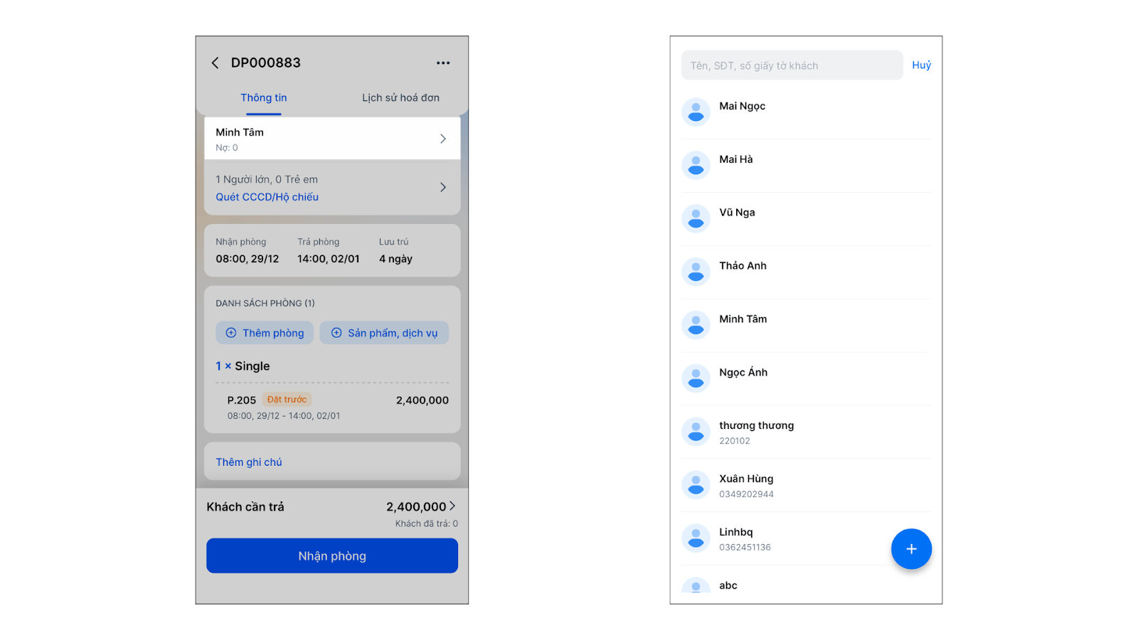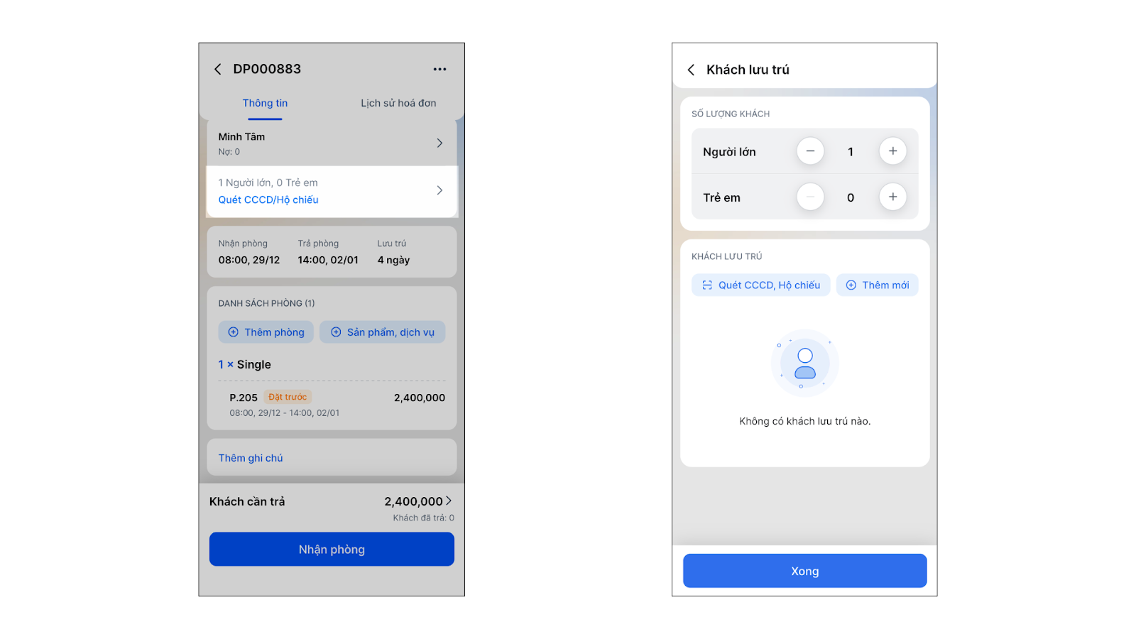 - Khách lưu trú: Sử dụng camera để chụp ảnh CCCD/Hộ chiếu. Ứng dụng sẽ tự động điền các thông tin định danh vào hệ thống.