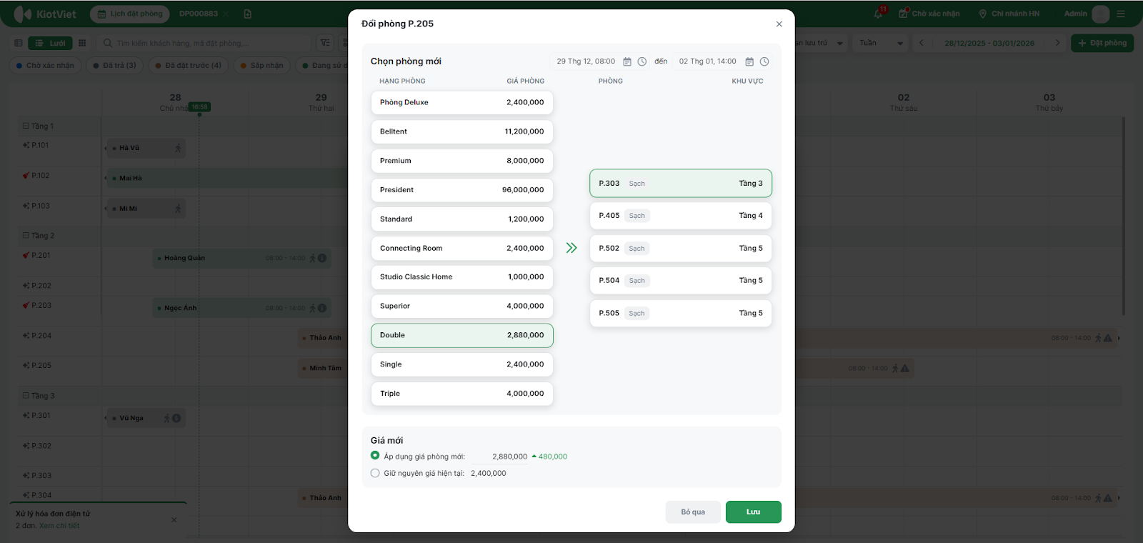 - Chọn phòng mới → chọn: Áp dụng giá phòng mới hoặc Giữ nguyên giá hiện tại (nếu đổi khác hạng phòng) → nhấn Xác nhận đổi.