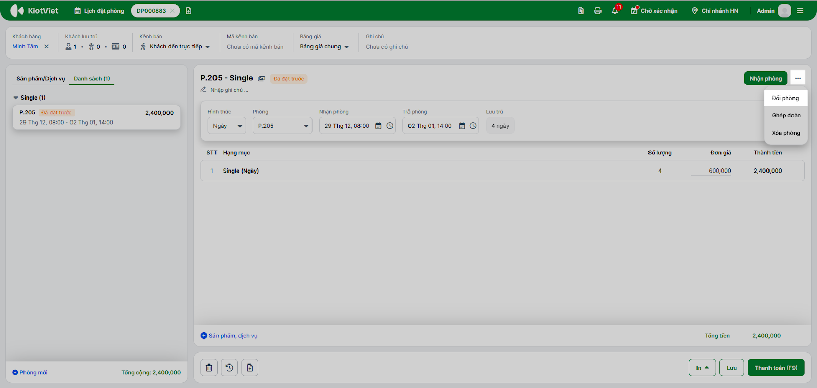 - Nhấn Lưu để hoàn tất. Hệ thống sẽ hiển thị thông báo đổi phòng thành công.