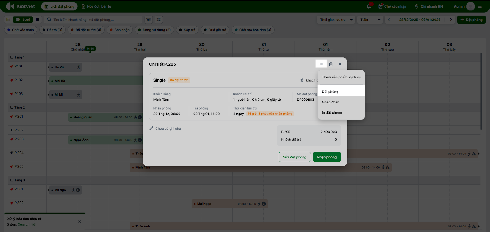 - Cách 2: Trong màn hình sửa đặt phòng, tại phòng cần đổi nhấn 3 chấm → Đổi phòng.