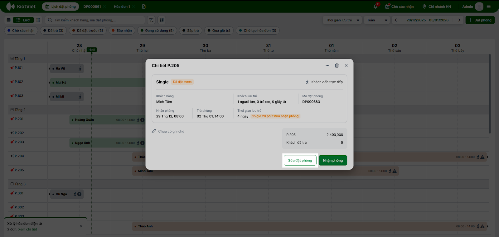 - Tại màn hình Lịch đặt phòng, nhấn vào chi tiết phiếu đặt phòng cụ thể → chọn Sửa đặt phòng.