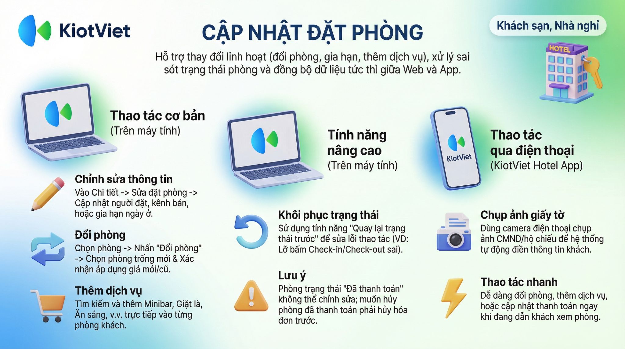 Tính năng Cập nhật đặt phòng trên ứng dụng KiotViet Hotel hỗ trợ cửa hàng thực hiện các thao tác: Đổi phòng, thêm dịch vụ và cập nhật thông tin khách hàng.