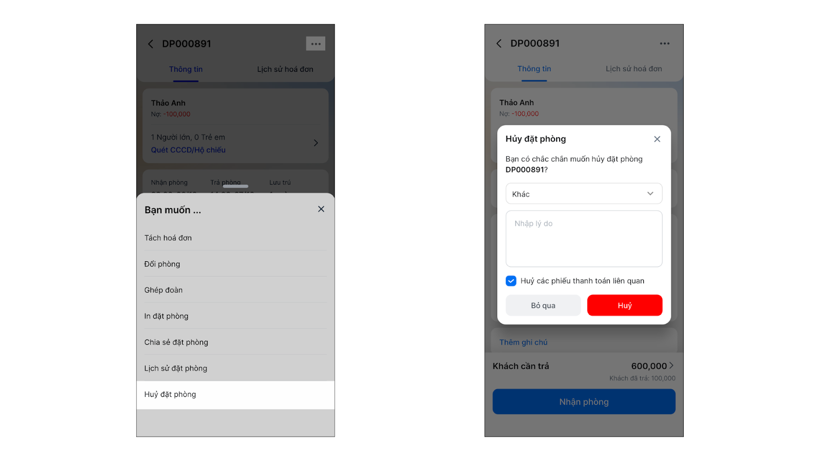 - Tình huống: Khách hàng đã chuyển khoản đặt cọc 500.000đ. Khi hủy phòng, bạn cần quyết định sẽ hoàn tiền (hủy phiếu thu) hay giữ lại khoản tiền này.