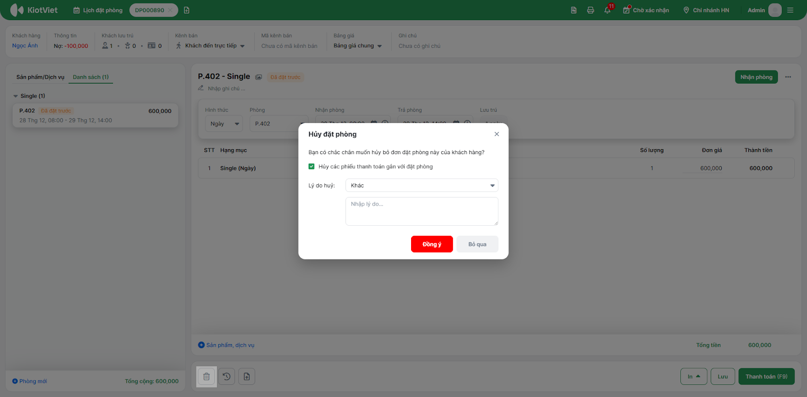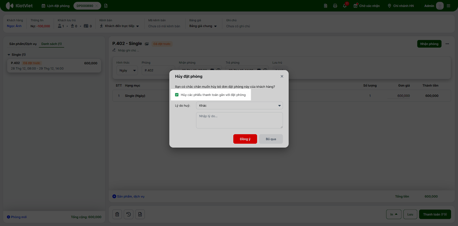 - Bạn tích chọn ô này nếu muốn hủy phiếu thanh toán gắn với đặt phòng.