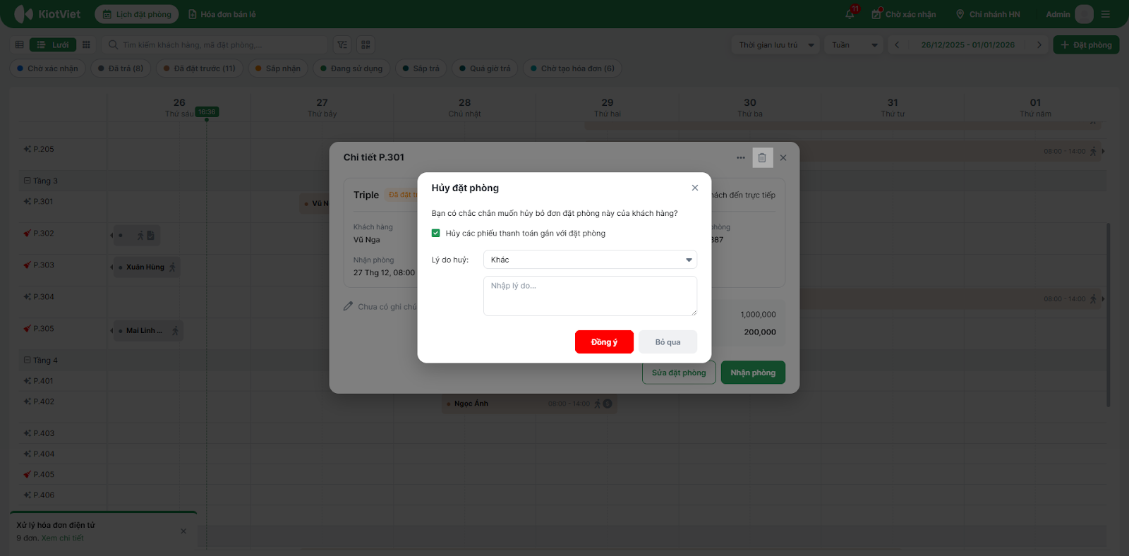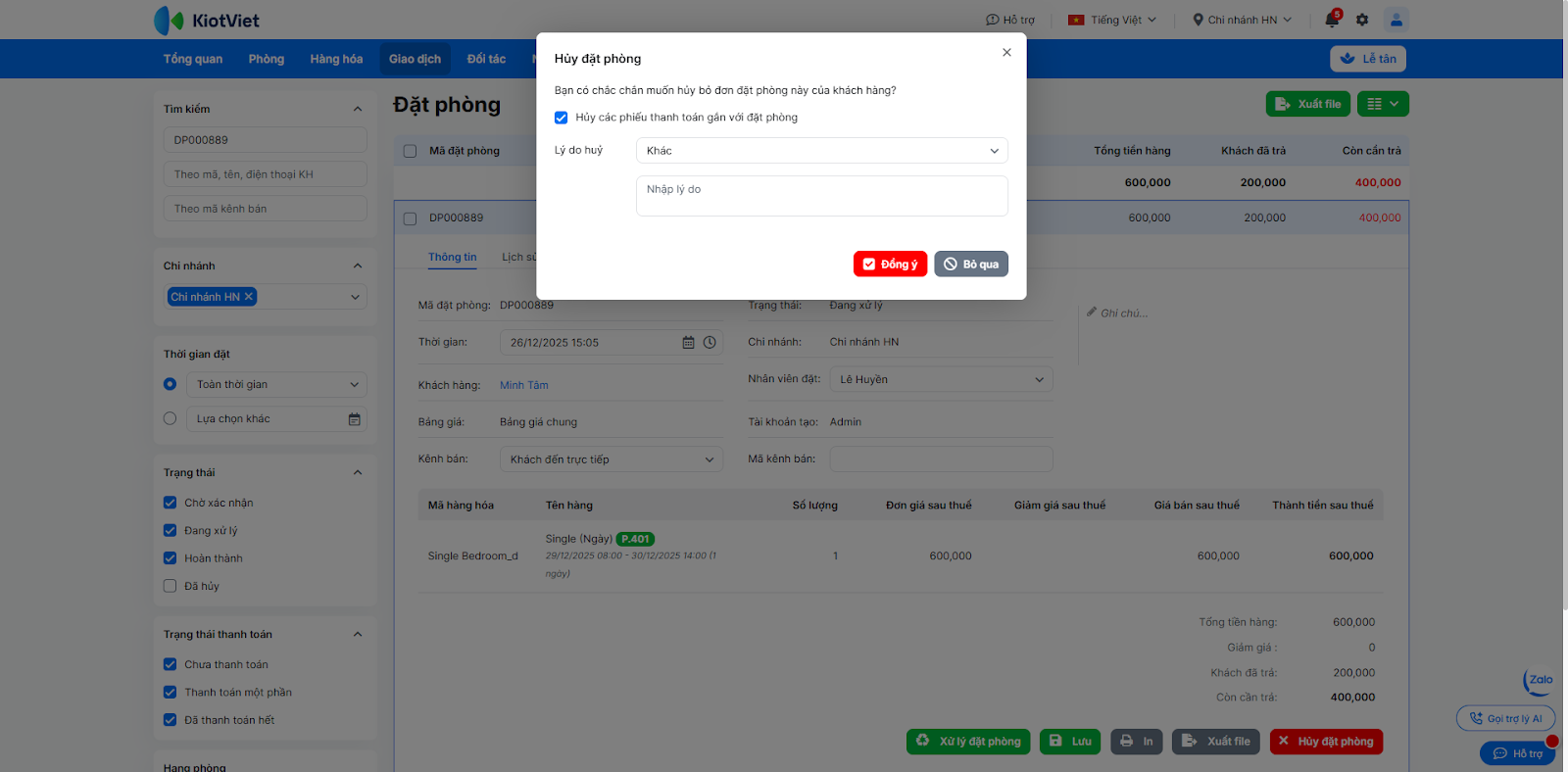 - Với đặt phòng đã có hóa đơn thanh toán: Hệ thống không hỗ trợ hủy trực tiếp. Bạn cần phải thực hiện Hủy hóa đơn trước, sau đó mới có thể quay lại đặt phòng để thực hiện thao tác Hủy đặt phòng.