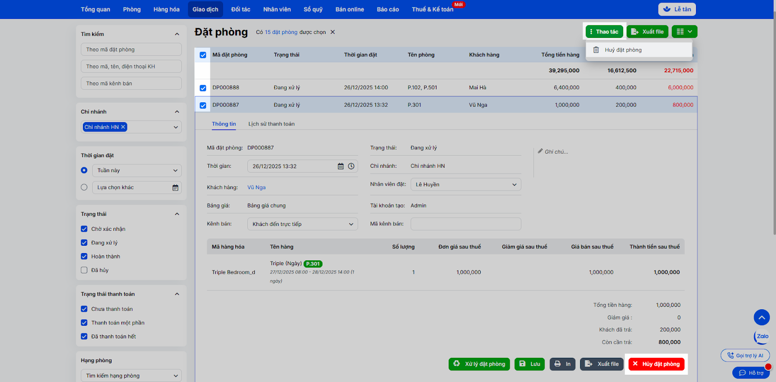 - Bạn nhấn Hủy đặt phòng trên chi tiết đặt phòng hoặc hủy hàng loạt bằng cách tích chọn nhiều đặt phòng → chọn Thao tác → nhấn Hủy đặt phòng.