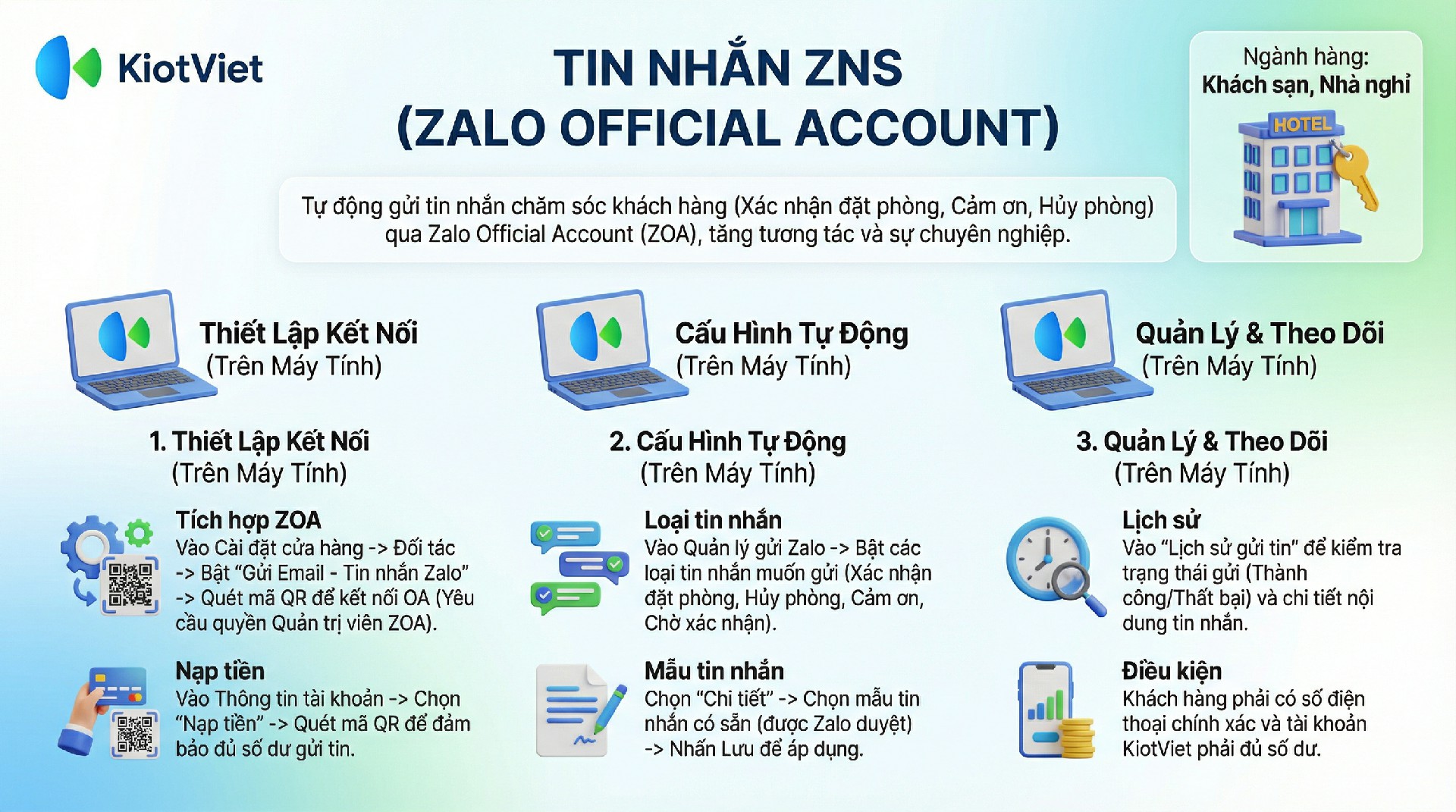 Chờ xác nhận đặt phòng: Hệ thống sẽ tự động gửi tin nhắn qua Zalo ngay khi khách hàng đặt phòng thành công qua kênh đặt phòng online của khách sạn.