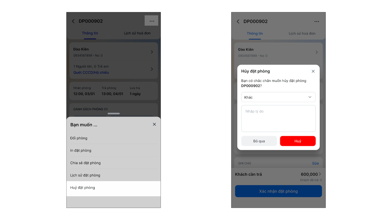 - Để hủy đặt phòng, trong chi tiết đặt phòng bạn nhấn 3 chấm → chọn Hủy đặt phòng → chọn Lý do hủy → nhấn Hủy.
