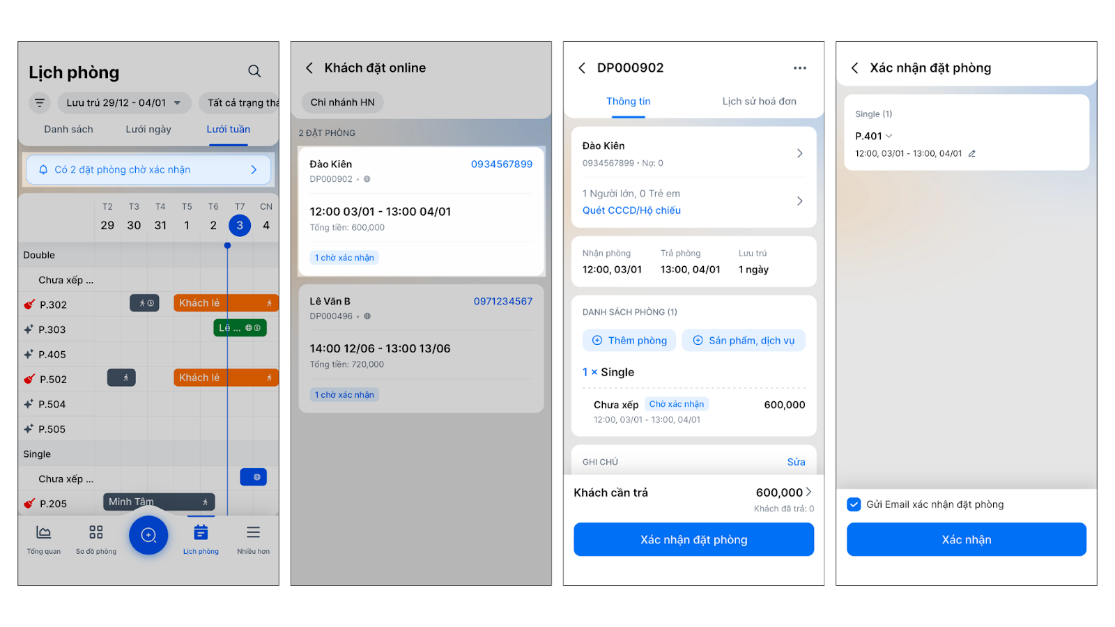 - Chọn đặt phòng cần xử lý → kiểm tra thông tin → chạm Xác nhận đặt phòng.