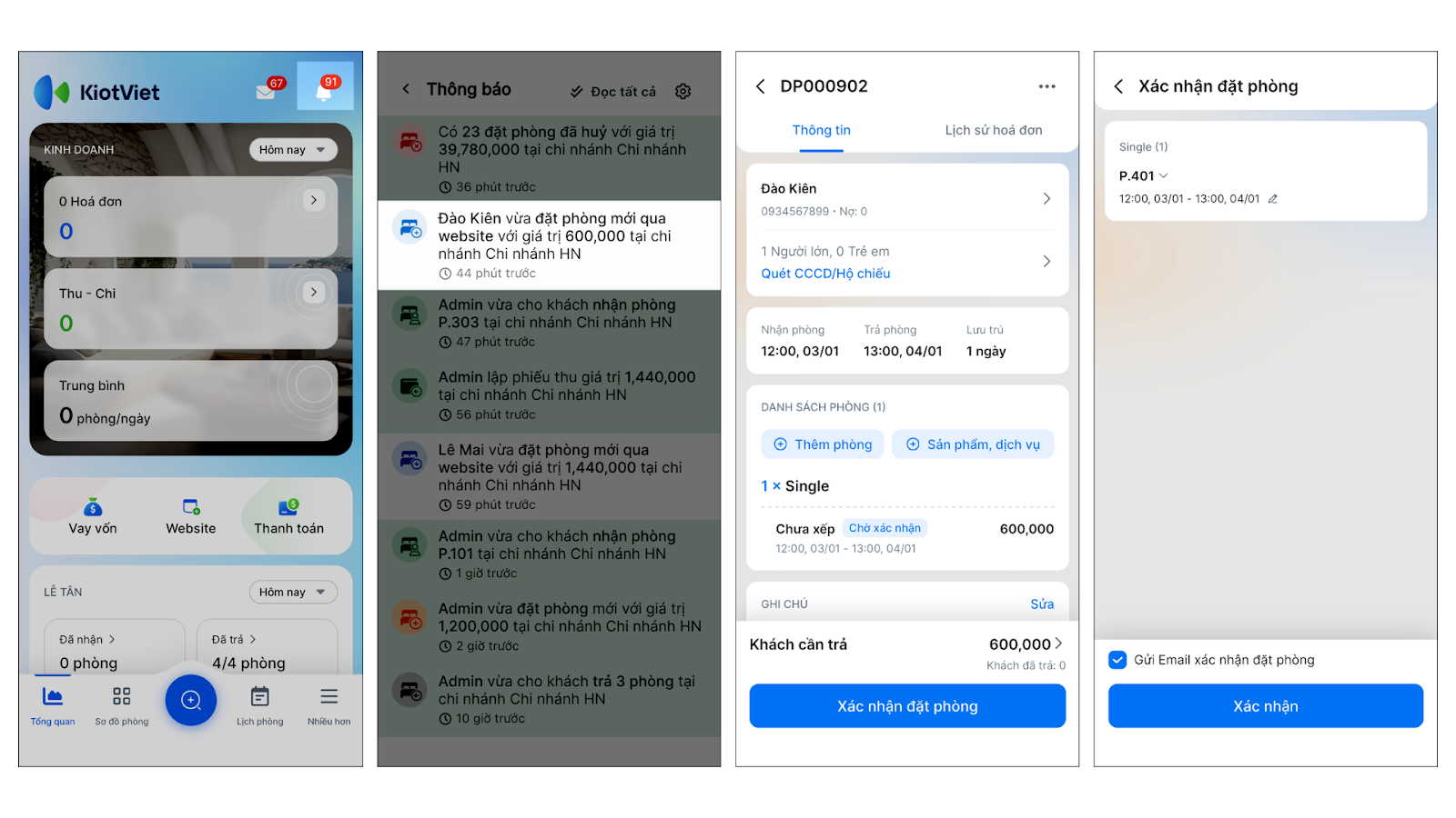 - Quản lý tập trung: Đơn đặt phòng đổ về một mối trên màn hình Lễ tân, tránh sót đơn hoặc trùng lịch.