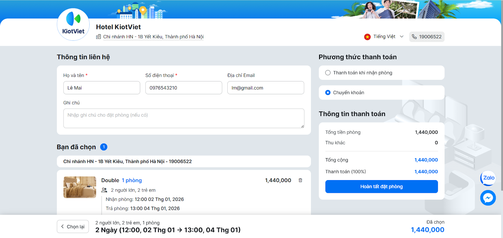 - Chọn Phương thức thanh toán: Thanh toán khi nhận phòng hoặc Chuyển khoản.