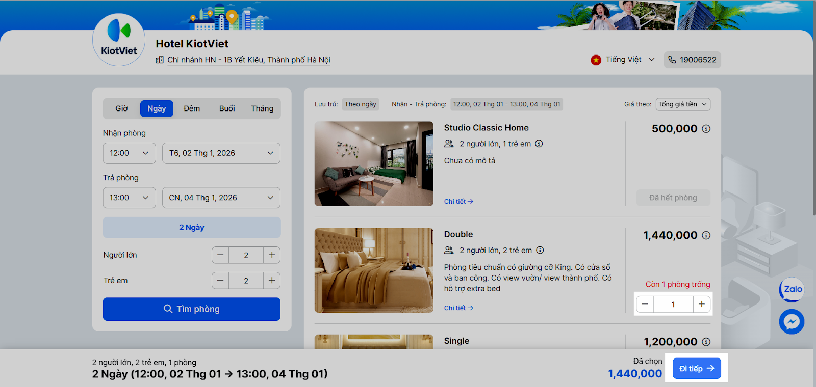 - Điều chỉnh số lượng phòng cần đặt → nhấn Đi tiếp.