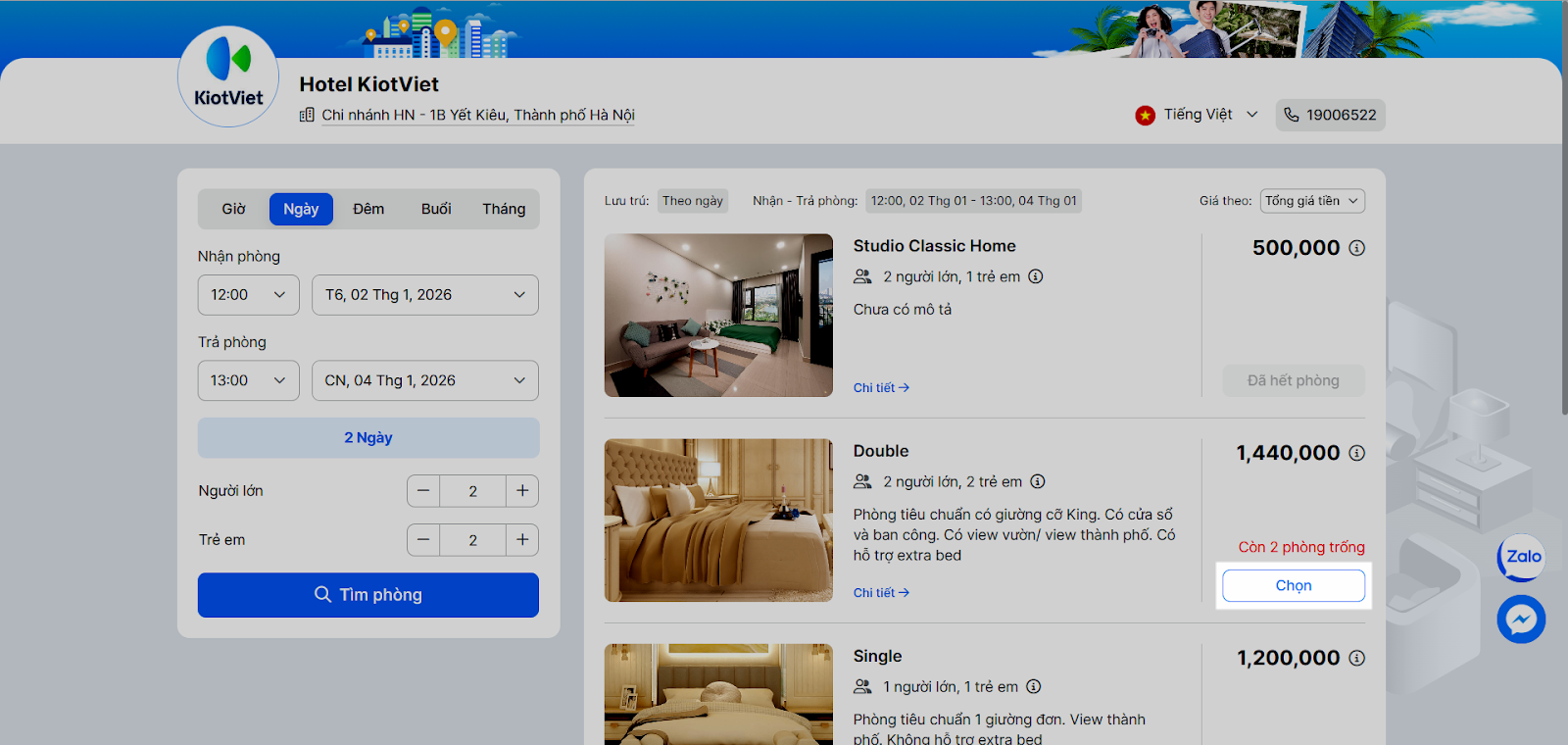 - Tìm phòng trống: Bên trái màn hình, khách chọn hình thức lưu trú, thời gian nhận phòng, trả phòng, số lượng người và bấm Tìm phòng.