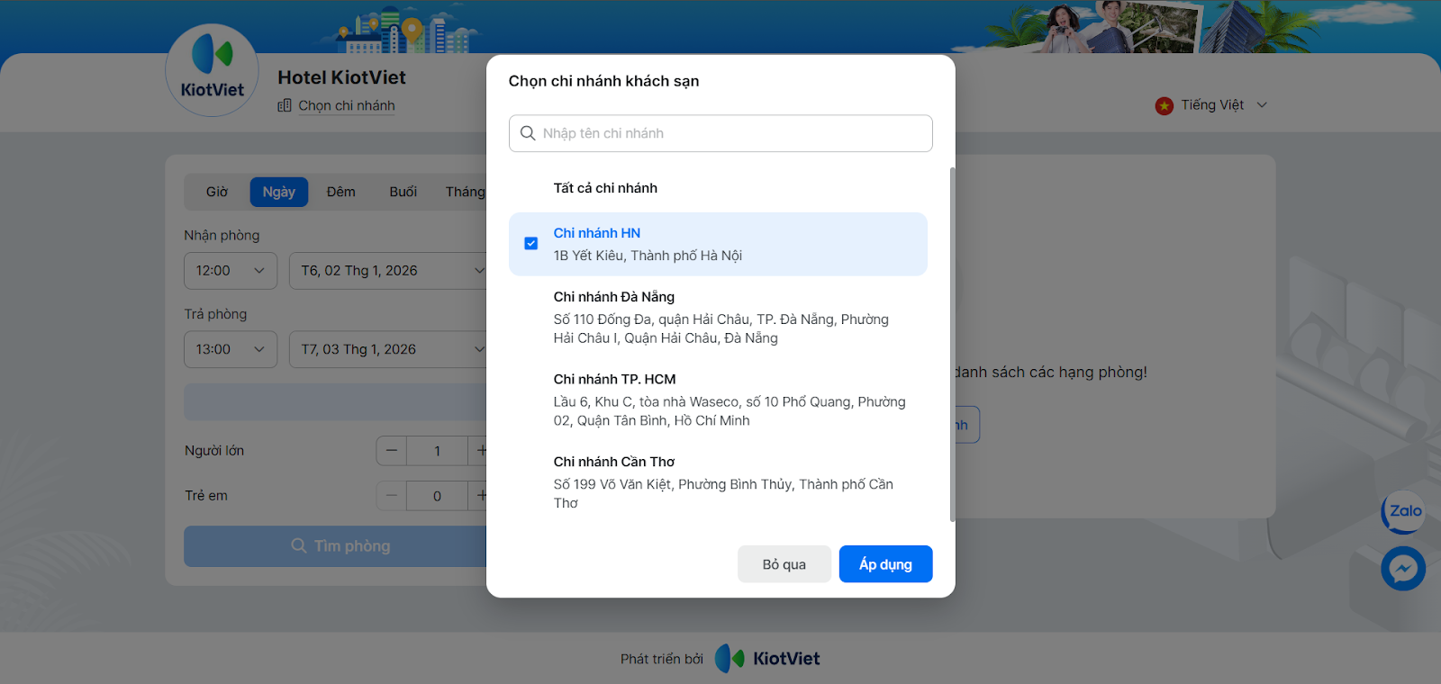 - Chọn chi nhánh khách sạn: Với khách sạn có nhiều chi nhánh/ cơ sở → khách chọn 1 chi nhánh cần đặt phòng → chọn Áp dụng.
