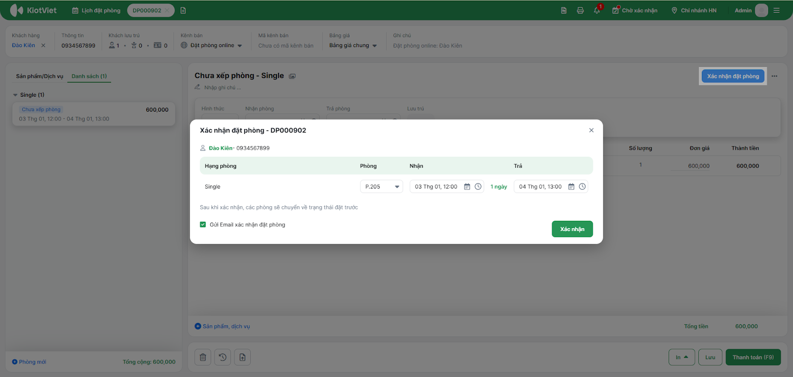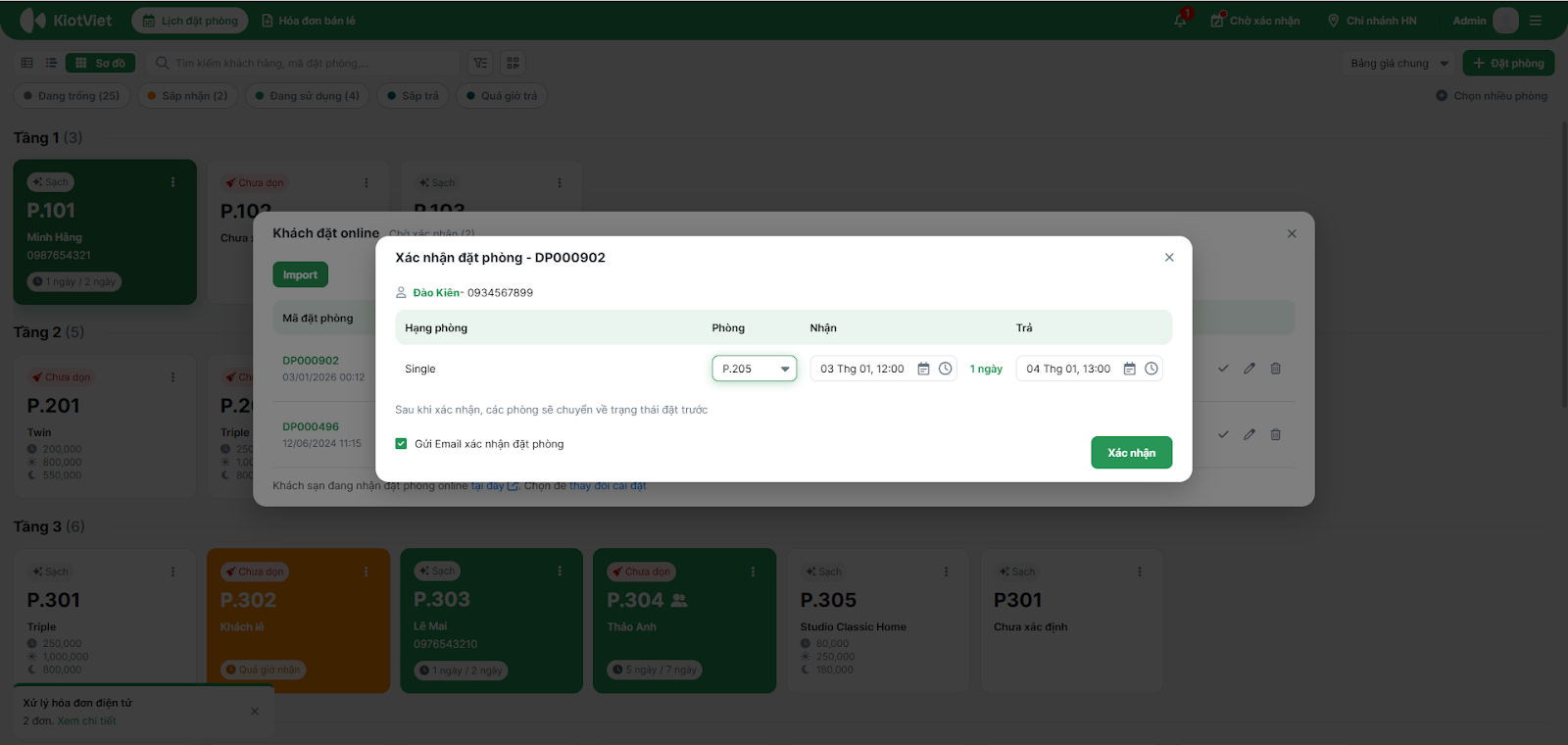 - Hệ thống mở pop-up Xác nhận đặt phòng: Bạn chọn phòng cụ thể (ví dụ: Phòng 205) cho khách.
